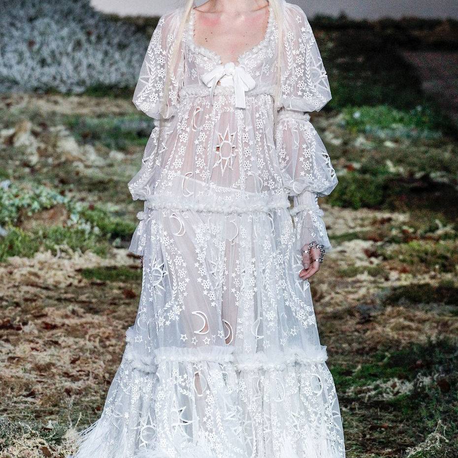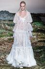 The two finale looks end on an ethereal note–long sheer gowns in ivory with eyelet details and finished in lightweight feathers give a romantic touch to the dark outing.