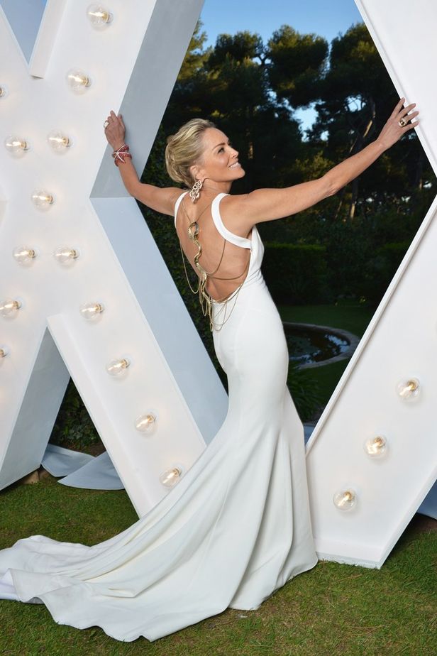 At the amfAR Cinema Against Aids 2013 Gala at the 66th Cannes Film Festival on Thursday night, Sharon Stone was the host and stole the limelight dressed in a Roberto Cavalli white gown with a surprising gold serpent reveal on low-backed dress.
