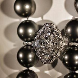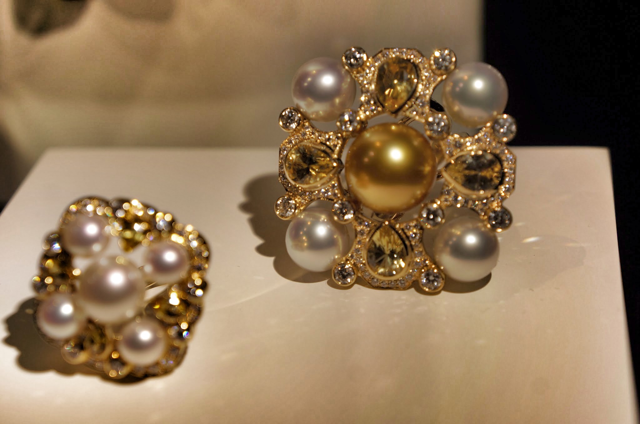 Whites, grey, blacks, warmly nuanced golds and pinks pearls are combined perfectly with diamonds, yellow diamonds, sapphires, tourmalines, aquamarines and amethysts, accentuated with yellow and white gold.