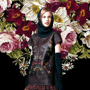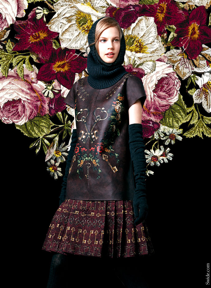 The incredibly detailed and delicate flowers contrast the armor-like structure of the pieces. To add to the medieval inspiration Dolce & Gabbana have included a key motif too. Contrast the texture and shape of the leather with luscious knits or brocade.