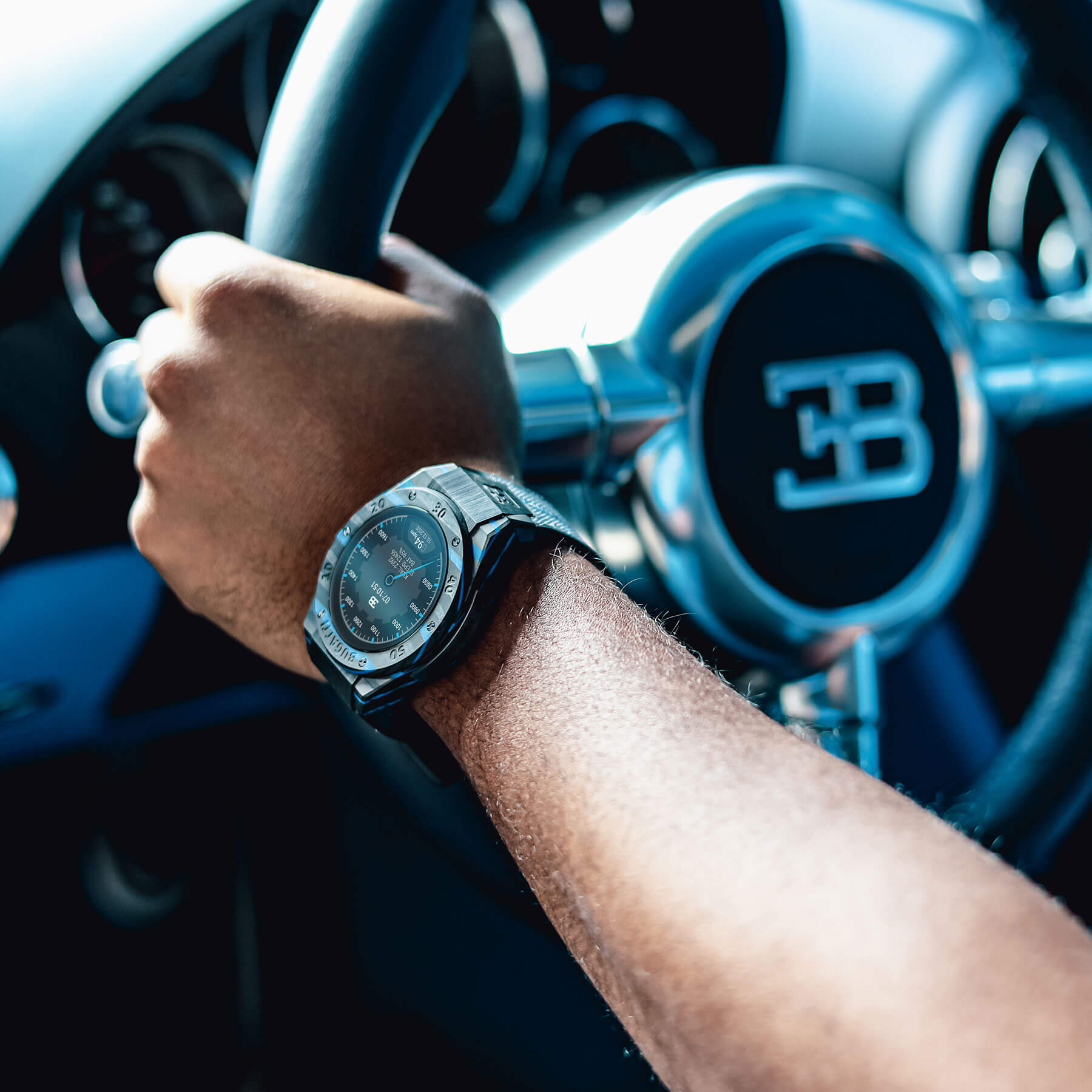 No other material is linked stronger to luxury sportscars than carbon. It is lightweight while offering extreme durability. For this reason, it is used for challenging applications like the monocoque of a Formula1 car, the fuselage of a Boeing 787, heat shields in space crafts, or the carbon chassis of the Bugatti Chiron. The carbon base material for the BUGATTI CARBON EDITION is manufactured in special Bugatti colors and CNC milled from solid. Both case and bezel are made entirely of carbon.