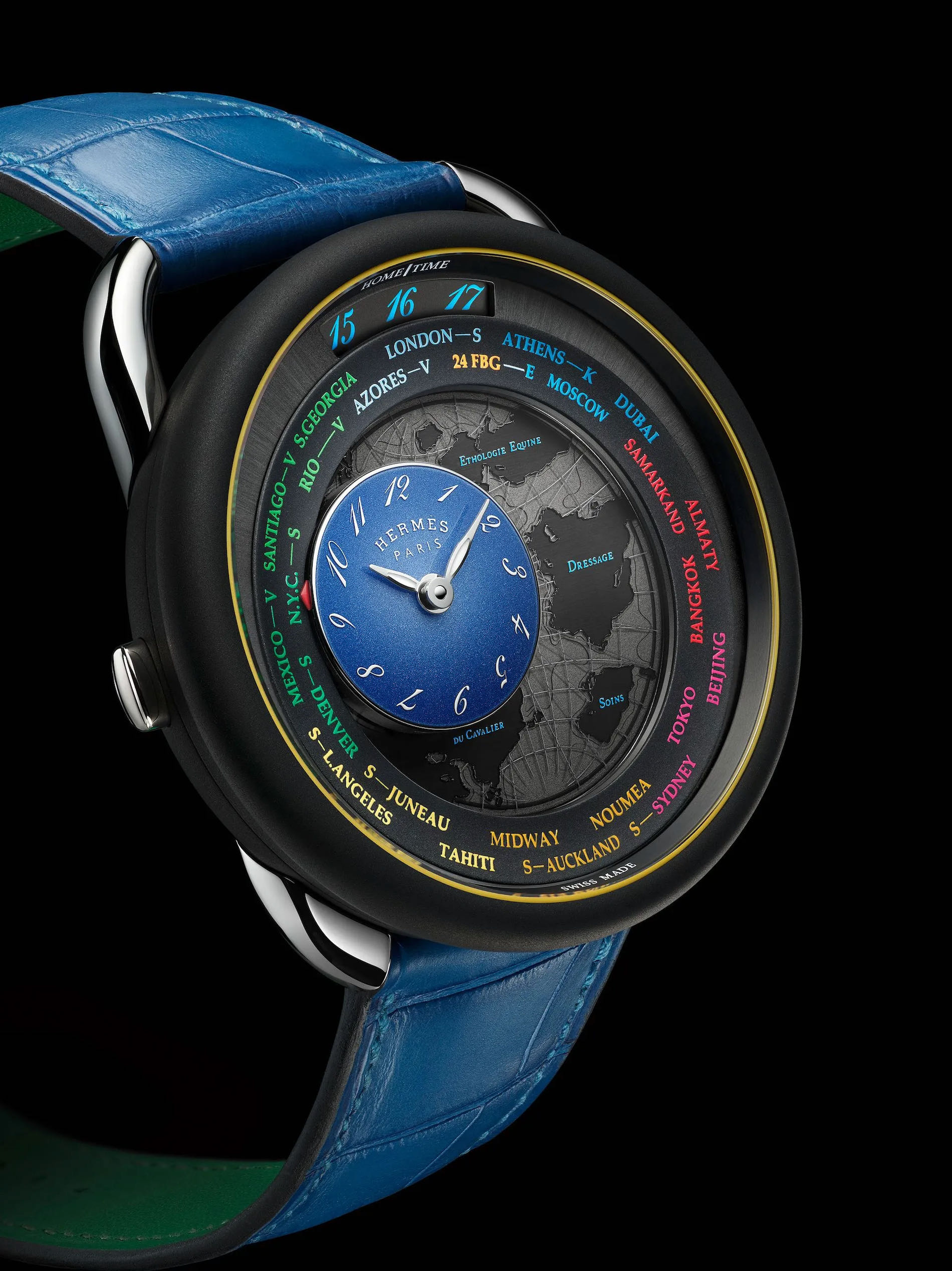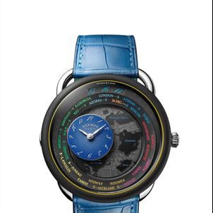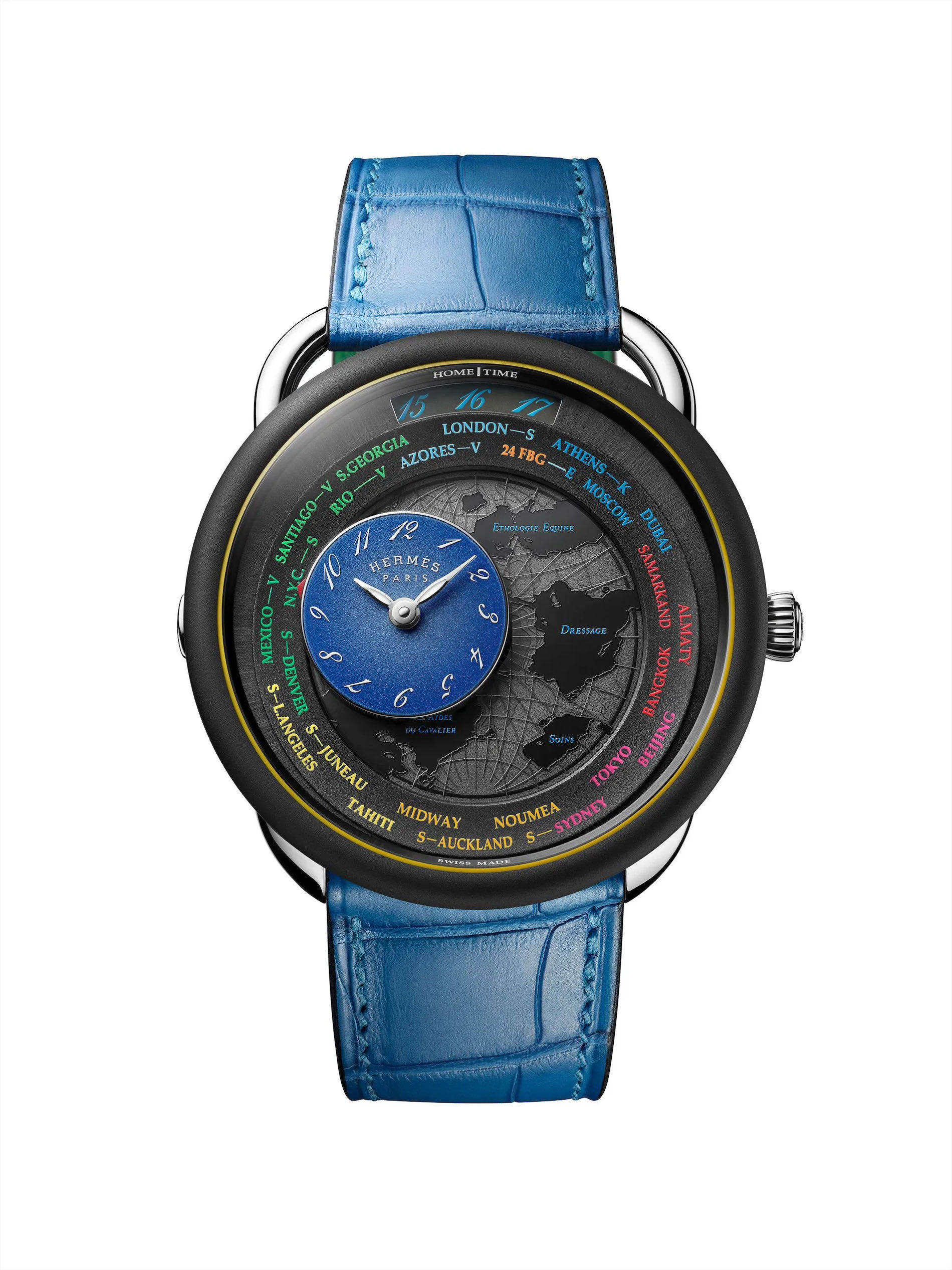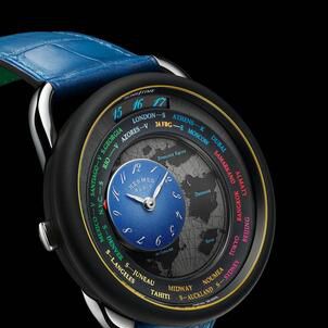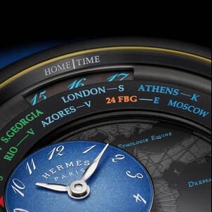 A gravitational counter travels across the continents, moving from city to city, flying over time zones. The "travelling time" mechanism exclusively developed for Hermès, reinterprets an Haute Horlogerie complication, displaying 24 time zones by means of a circular disc.