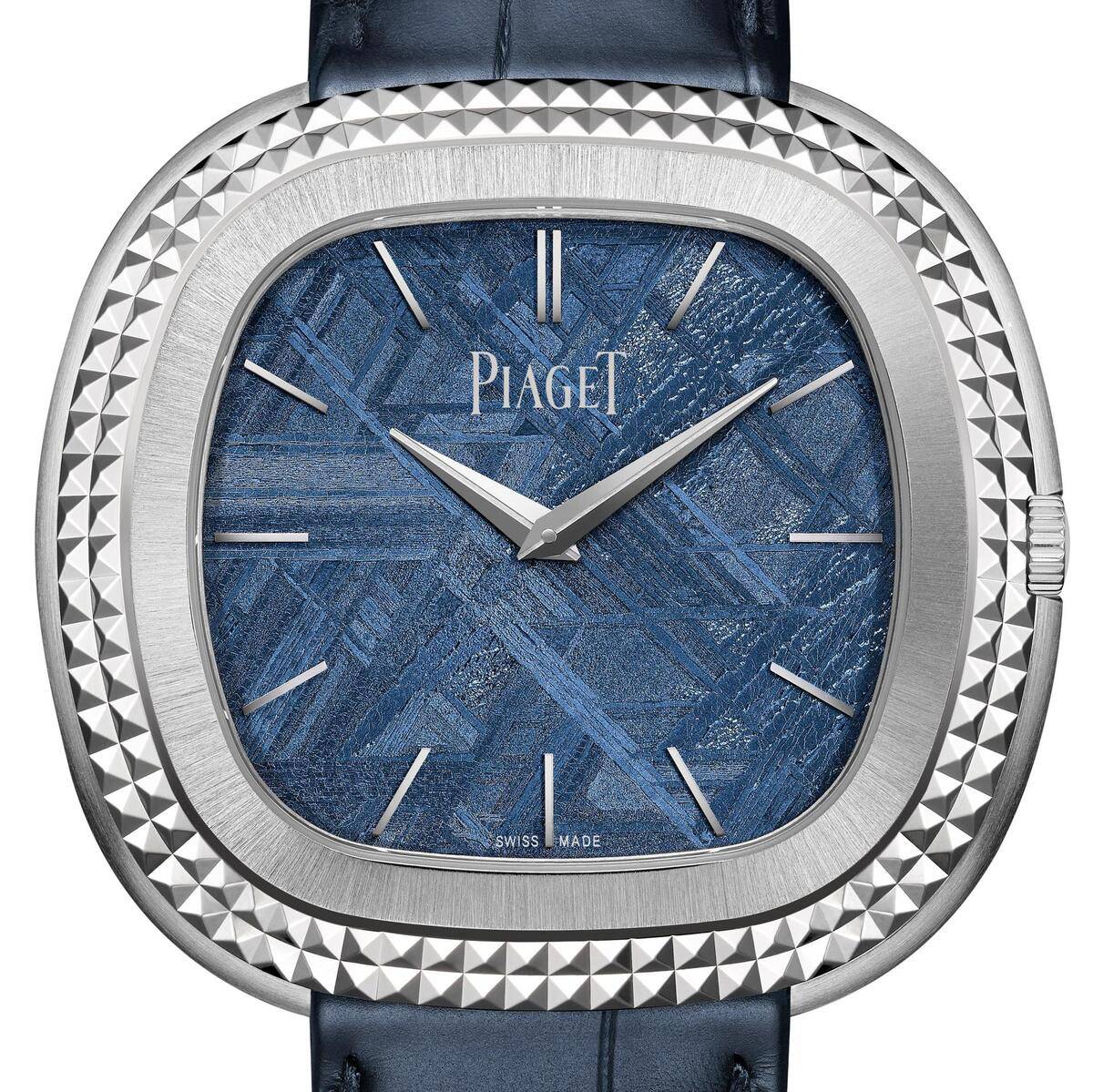 At its centre glows a dial like no other — a slice of blue meteorite, chosen for its rarity and cosmic beauty. Its shimmering facets echo Piaget’s tradition of working with ornamental stones, while its intense hue imbues the watch with a sense of distinction reserved for only the Maison’s most exceptional creations.