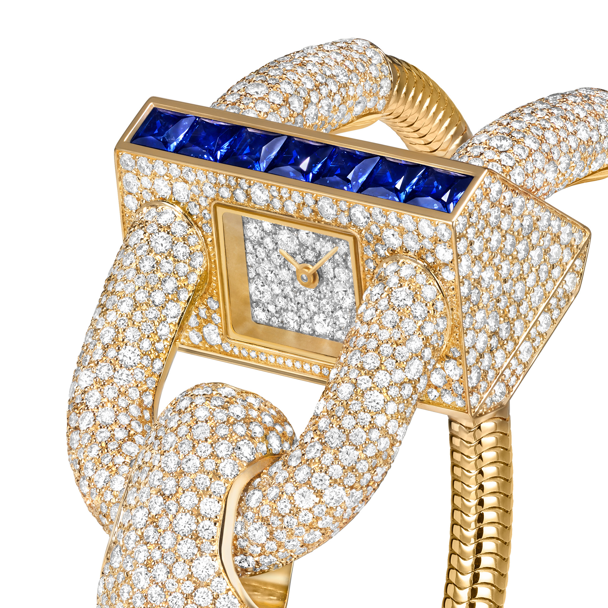 The latest iteration shimmers in yellow gold, its case entirely paved with a snow setting of brilliant diamonds, each stone seemingly scattered like stardust. A luminous row of princess-cut sapphires lends a stroke of regal intensity, a touch of color that elevates the watch from timeless to transcendent.