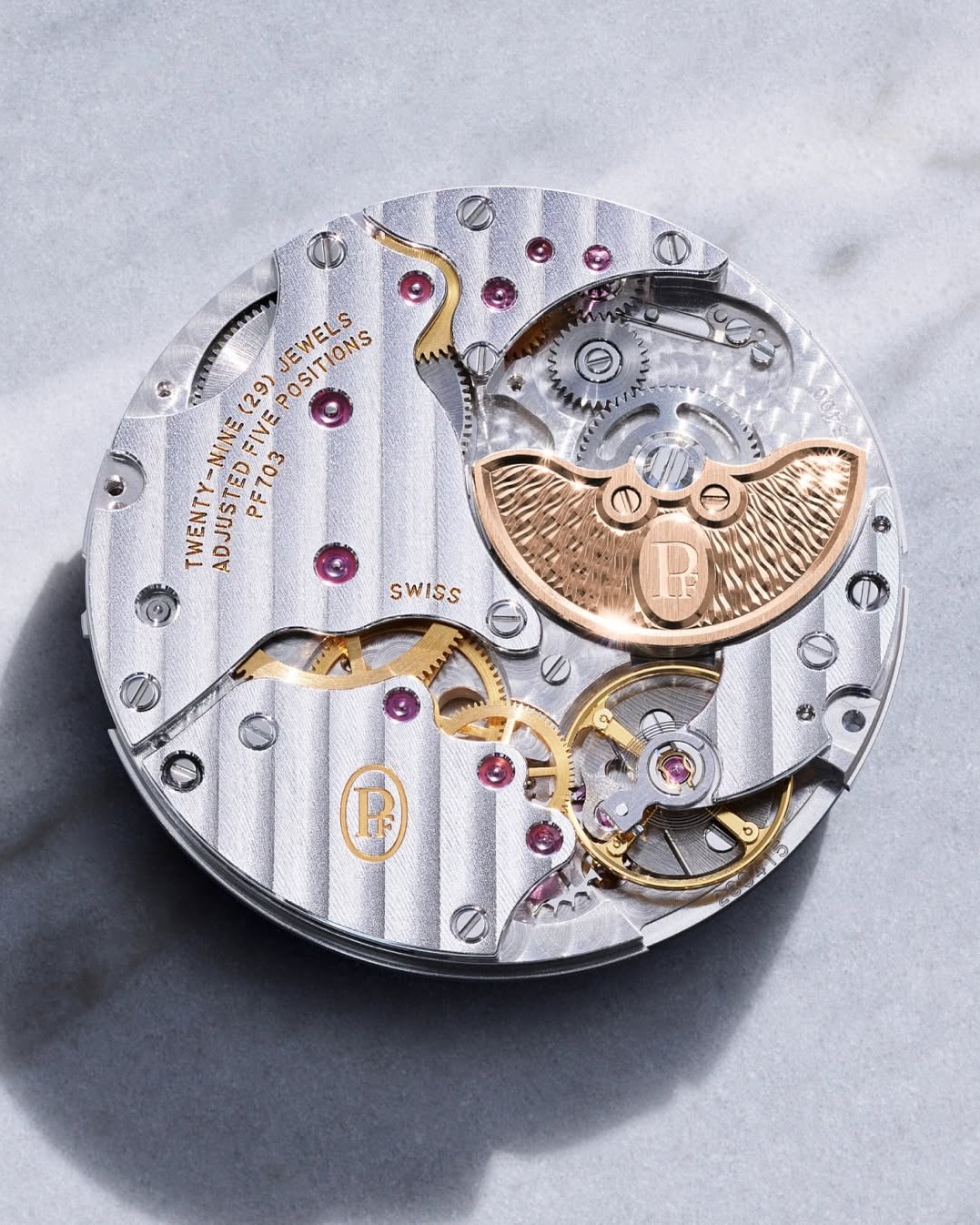 The true marvel, however, lies within. Powering this slender wonder is the automatic PF703 calibre. The watch achieves its remarkable thinness—just 7.8 mm—thanks to an extraordinary 22-carat rose gold micro-rotor. Integrated directly into the main plate and delicately adorned with matching Grain d’Orge guilloché, this micro-rotor provides precise automatic winding and a 48-hour power reserve, all while preserving the collection’s signature, elegantly slender profile.