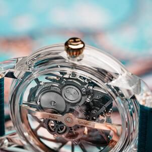 The visual impact is immediate as micro-sculpture takes center stage to ensure the mask emerges in three distinct dimensions. A 100 percent sapphire case creates a spectacular illusion that the mask is being worn directly on the wrist. This transparent housing is a tour de force that is manufactured entirely in La Chaux-de-Fonds without the use of screws or inserts. The result is a perfectly clear and unobstructed view that allows the most intricate details of the craftsmanship to be admired from every angle.