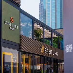 Breitling takes center stage with its signature yellow accents adding a vibrant pop of color to the facade. The Swiss watchmaker has created a welcoming atmosphere that invites guests to step out of the sun and into a world of precision luxury. But they are not alone in this horological haven. The pavilion also proudly displays the banner of Universal Genève which signals a thrilling new chapter for the heritage brand under the same roof. Even the historic name of Gallet makes an appearance to complete a trinity of watchmaking excellence.
