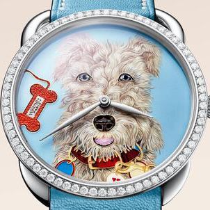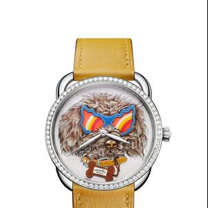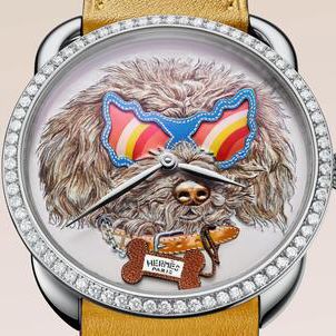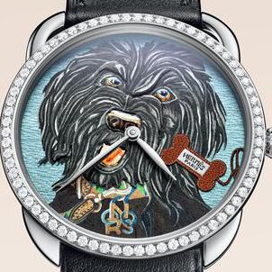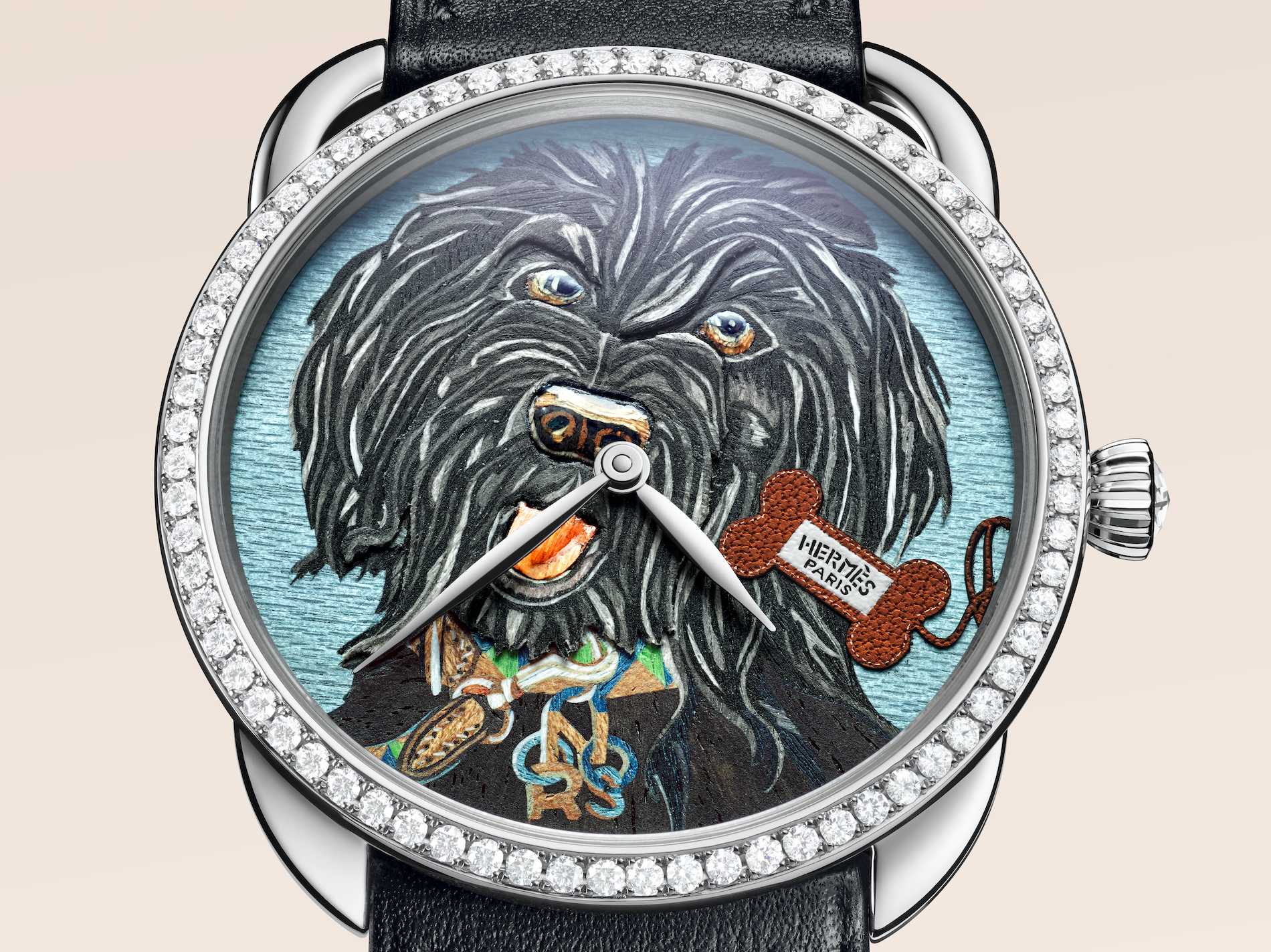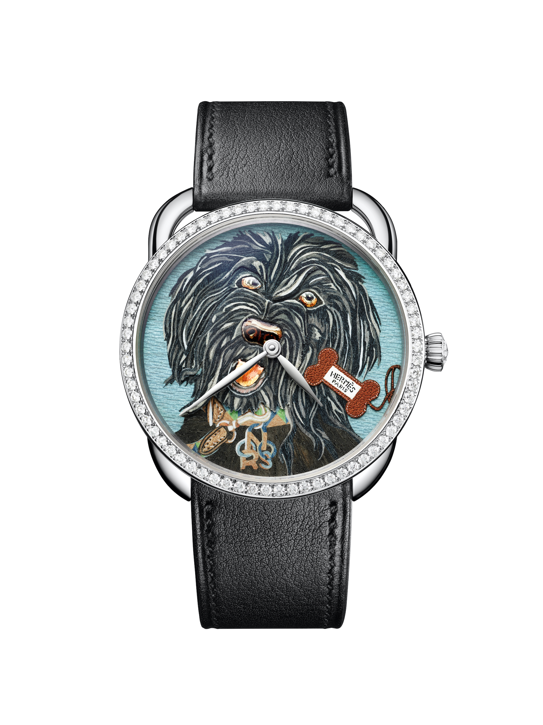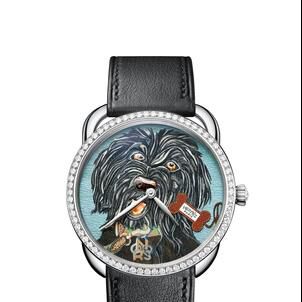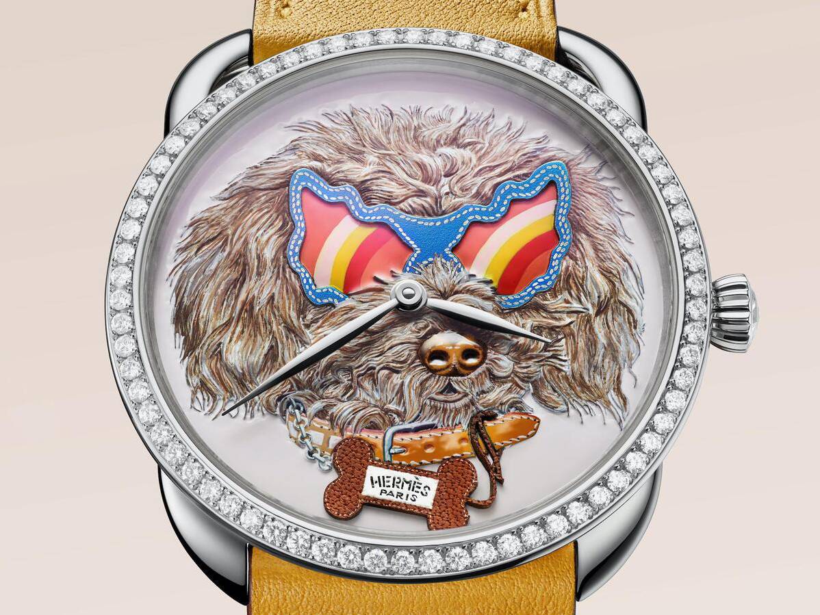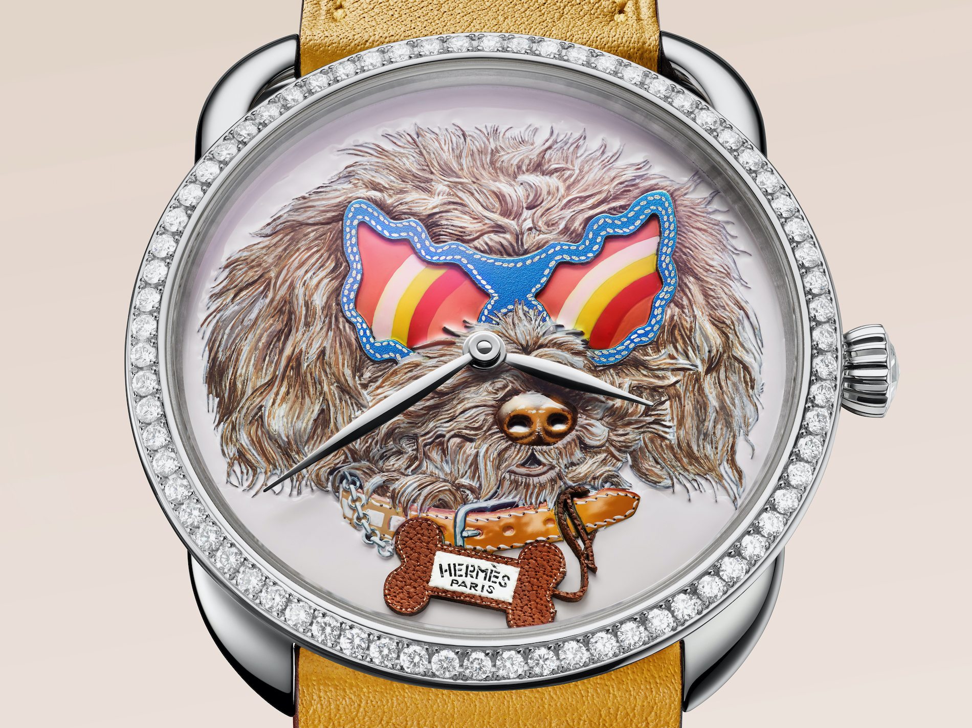 Originally designed by Henri d'Origny in 1978, the Arceau silhouette is celebrated for its asymmetrical lugs inspired by the equestrian world of stirrups. In this new bestiary inspired by artist Liz Stirling’s silk scarf designs, the maison presents three mischievous dogs named Orson, Amy, and Taco. Each portrait is a masterclass in horological artistry, featuring a unique leather bone at the center as a nod to the house's storied leatherworking heritage.