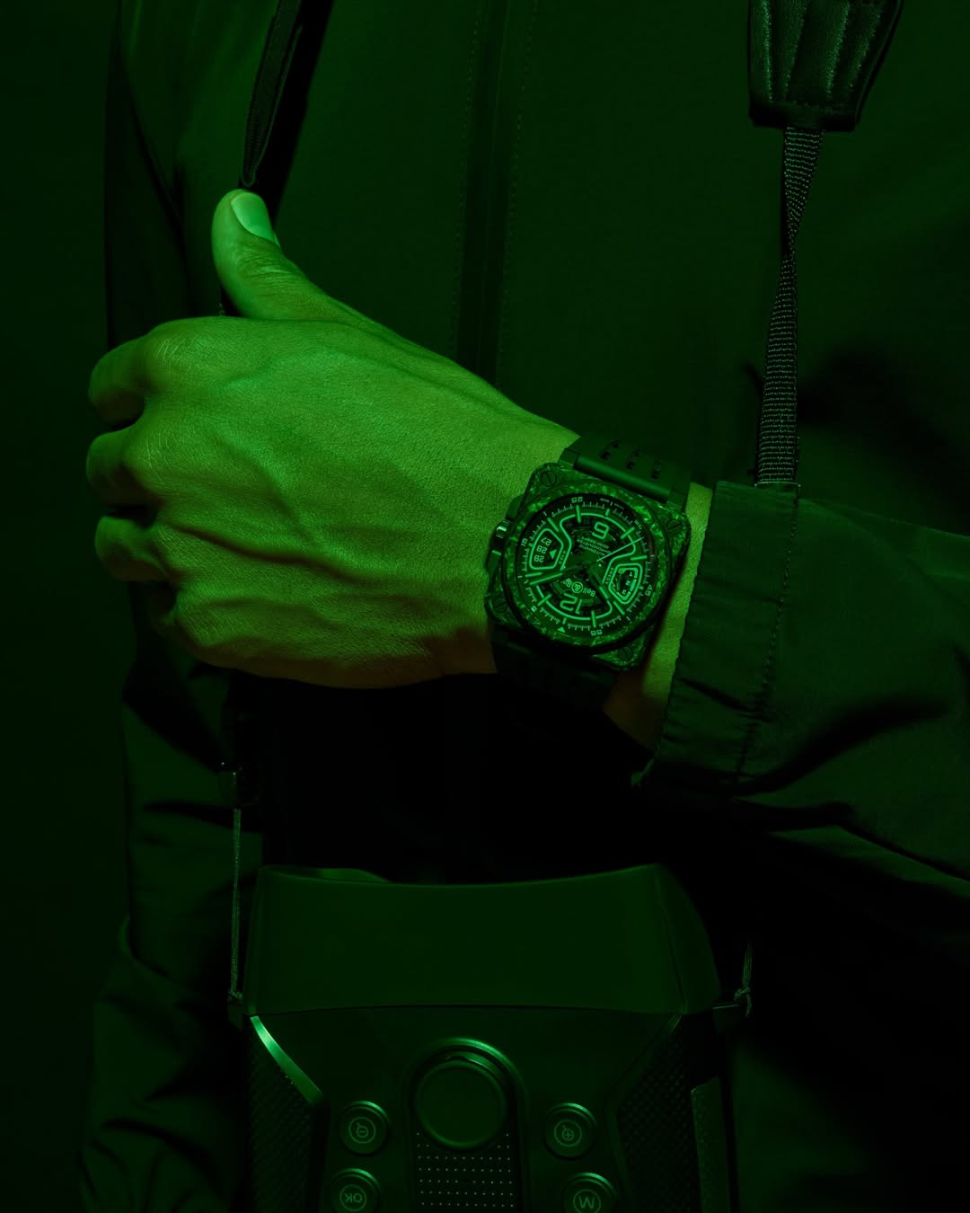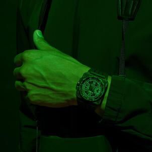 The 41mm case features an innovative sandwich construction that ensures maximum robustness through a blend of advanced components. Its main plates are crafted from LUM-CAMO, an exceptional material that combines carbon fiber with a photoluminescent resin. This tech-forward camouflage is complemented by a middle case made of titanium coated in sleek black PVD. Even the green rubber cylinders housing the case screws are photoluminescent, casting a techno-futuristic glow that extends far beyond the simple display of time.