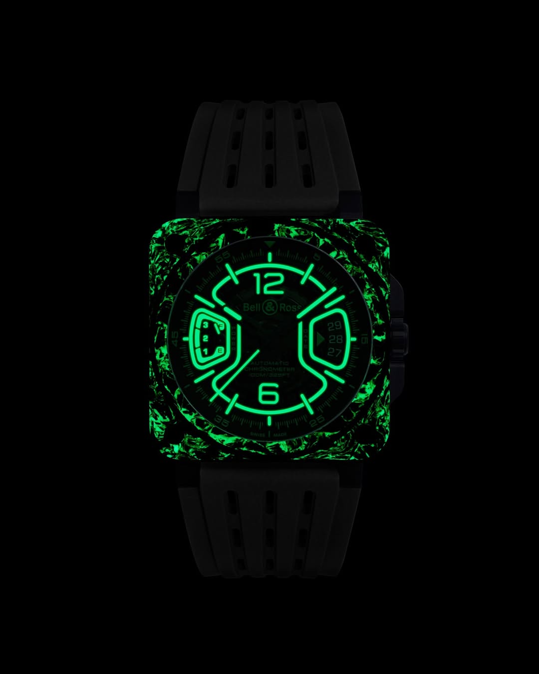 Every detail of the face is a graphic interpretation of luminescence, featuring green Super-LumiNova on the numerals, indexes, and hands. The choice of green is a deliberate nod to the aeronautical head-up display systems used by fighter pilots. With its 100-meter water resistance and openworked black rubber strap, the watch balances extreme functionality with an aesthetic boldness that immerses the wearer in the heart of an aerospace control center.