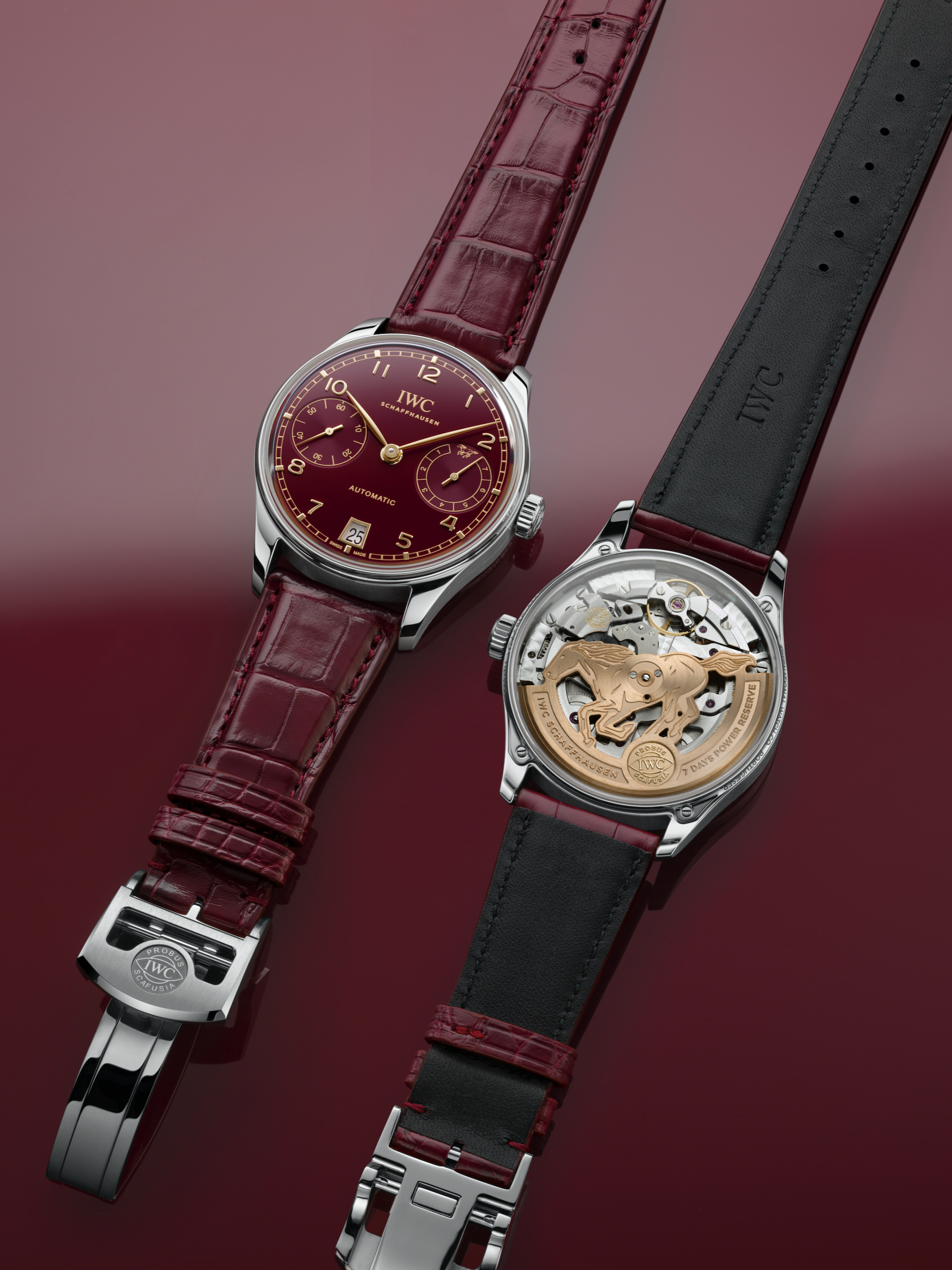 For added versatility, the timepiece is delivered with both black and burgundy alligator leather straps, each secured by a stainless steel folding clasp. This elegant creation serves as a sophisticated companion for those pursuing new goals with the same courage and adventure that the horse embodies.
