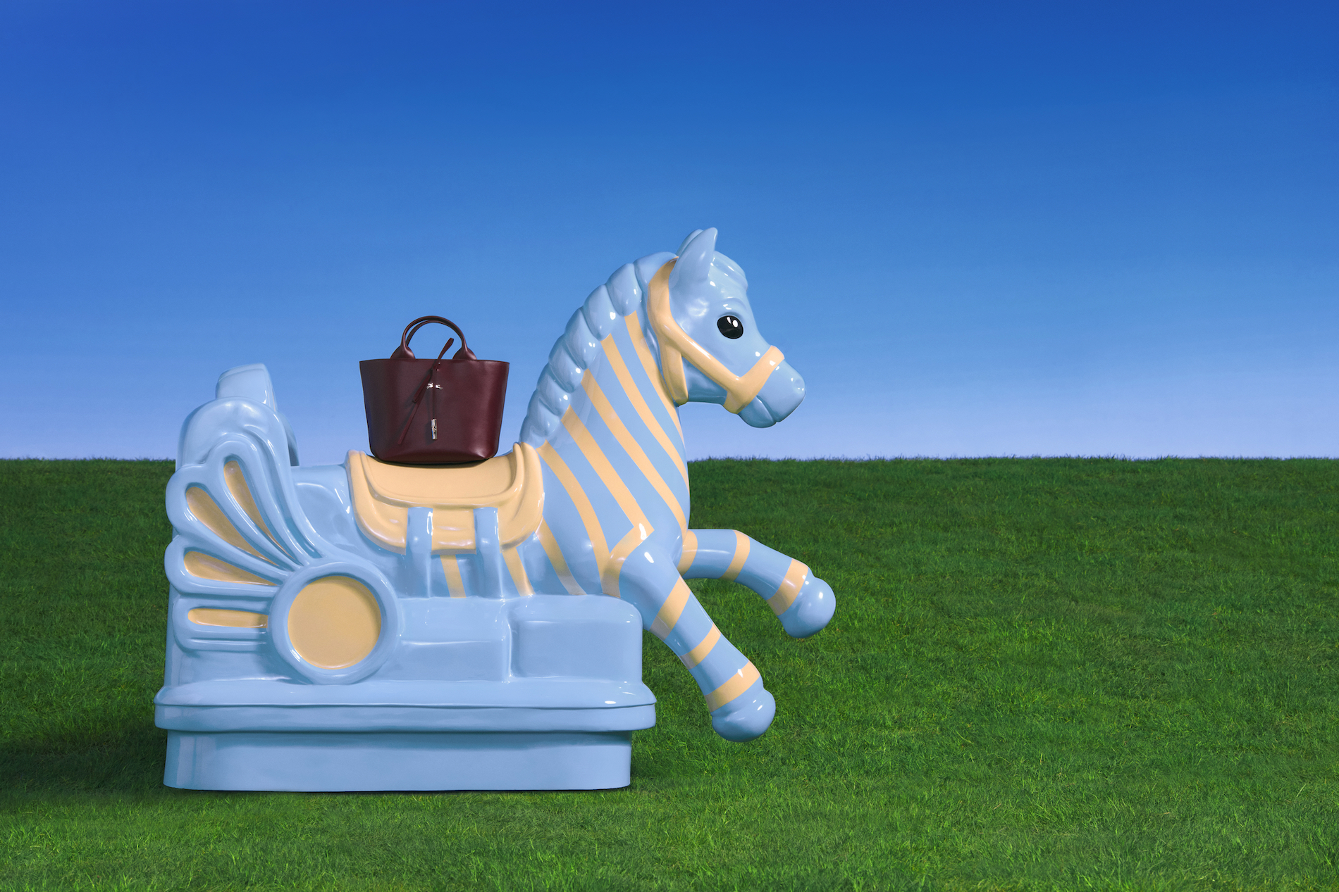 The accompanying campaign, titled Riding the Spring Breeze, stars top model Cici Xiang and was captured by photographer Leslie Zhang. The visuals reveal a poetic and pop-inflected universe featuring reinvented horses that invite a nostalgic journey back to childhood. Set against a tongue-in-cheek décor of dazzling blue skies and bright green grass, the campaign reflects the sense of optimism and renewal that defines both the change of seasons and the core values of Longchamp.