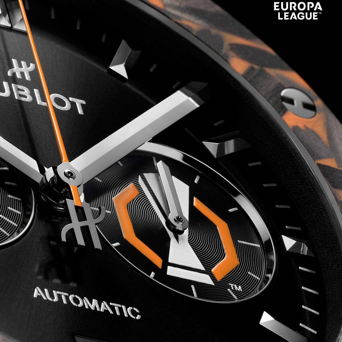 Inside the watch beats the HUB1153 automatic chronograph movement, featuring a meticulous reproduction of the UEFA Europa League logo at the 3 o'clock position. The competition cup is encircled by a fine orange line, a detail that is repeated on the sapphire crystal case-back. To complete the experience, the timepiece is presented in a box that includes a miniature reproduction of the UEFA Europa League trophy.