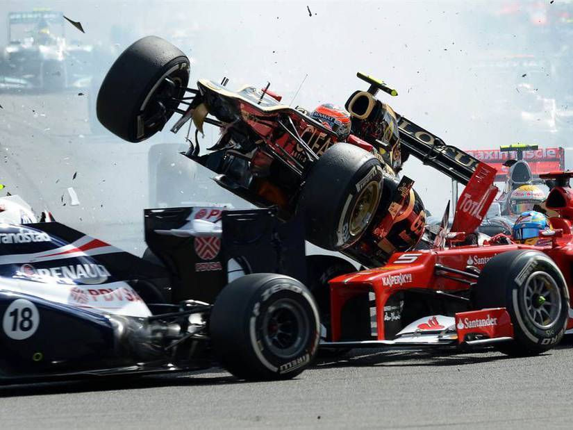 The Briton had nowhere to go and the concertina effect lifted Grosjean's car into the air and skimming across the front of championship leader Fernando Alonso's Ferrari, the Spaniard fortunate not to be hit on the head.