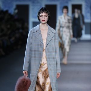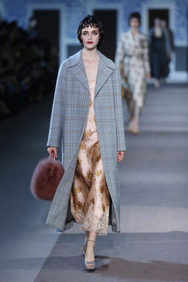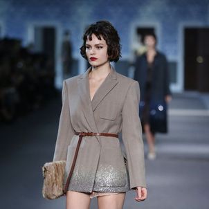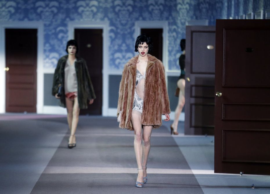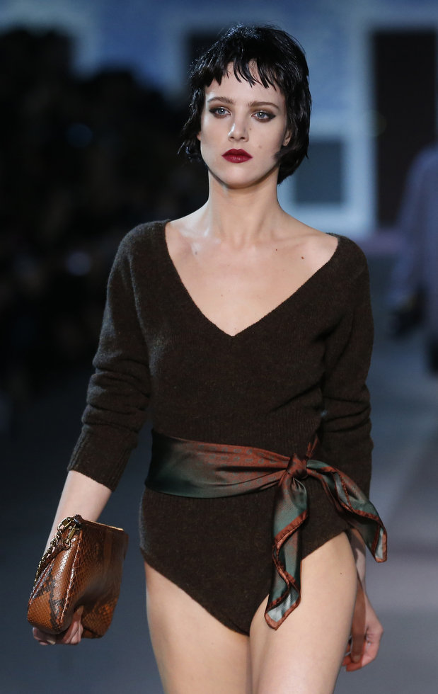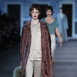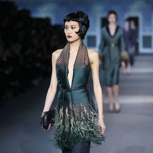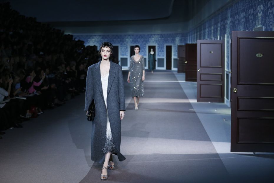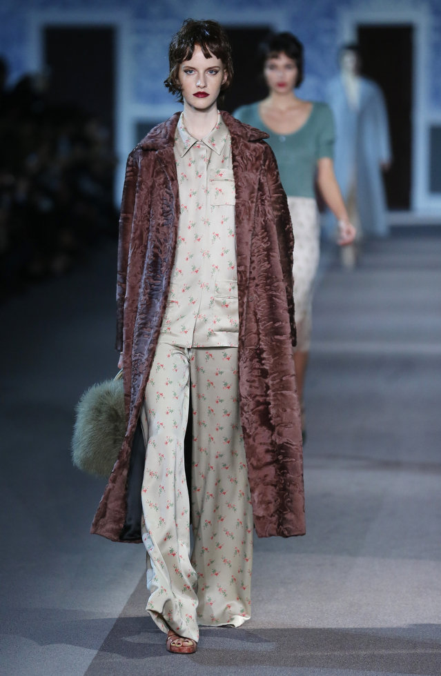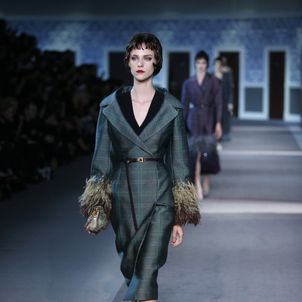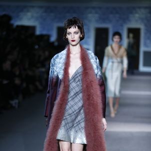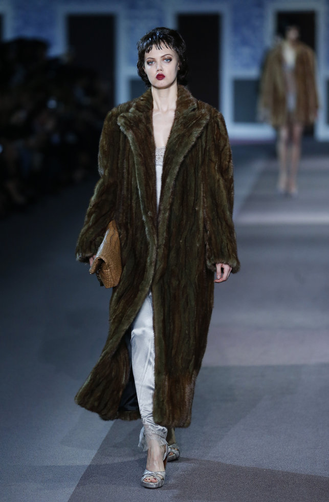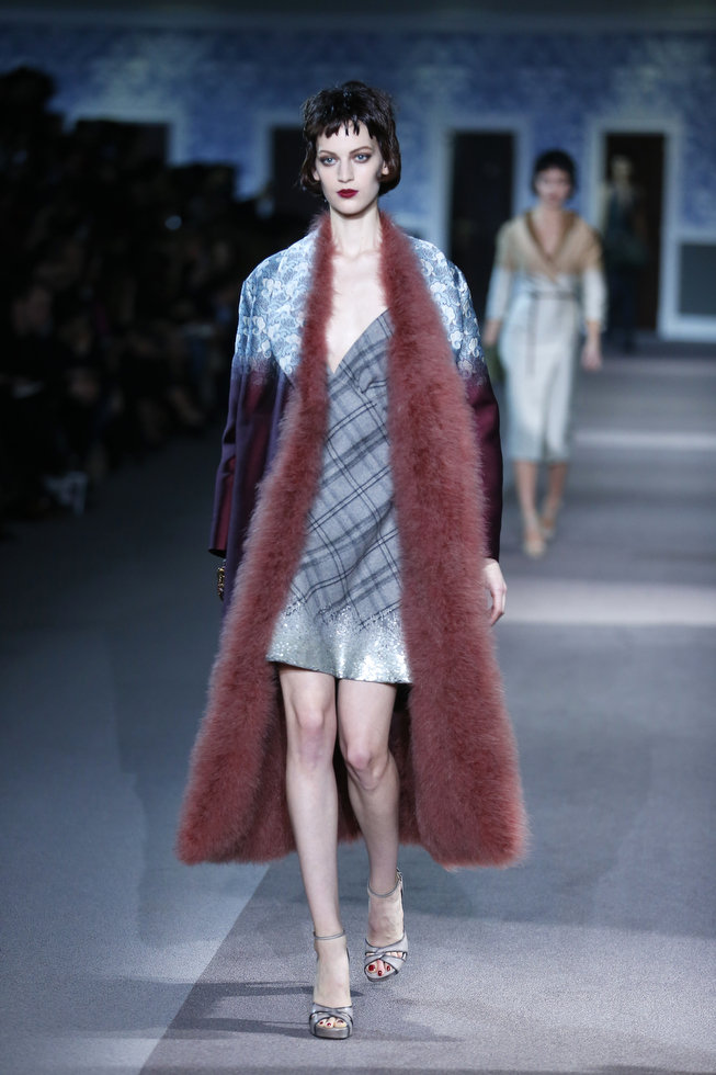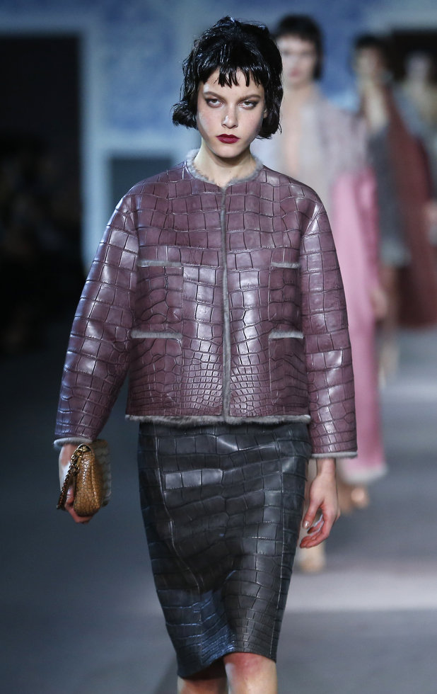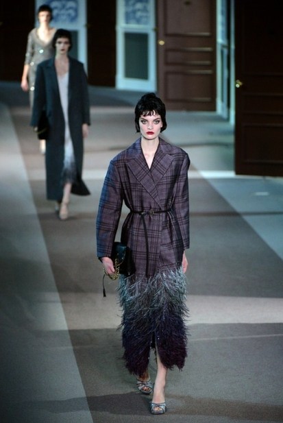The numerous long fur coats — some of the most luxurious seen this season — also provided a glam-factor. Mink coats dyed in two tones and murky-colored astrakhan were stand outs — as well as crocodile bags lined with sheared mink, lashings of marabou feathers and hand-curled goose feathers.