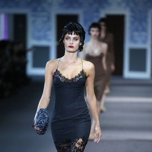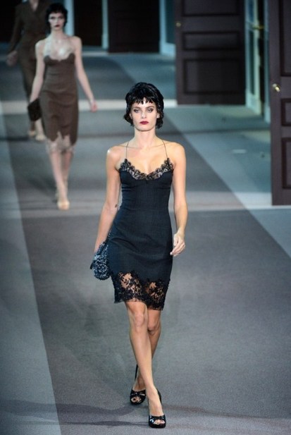 Suddenly the doors opened, out of which slinked models in’50s wigs wearing satin dresses resembling slips. A bathrobe made from a man’s coat followed a crepe dress made with motifs of an undergarment.
