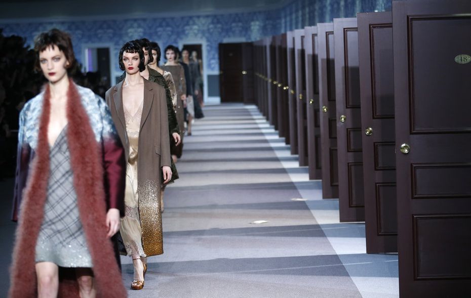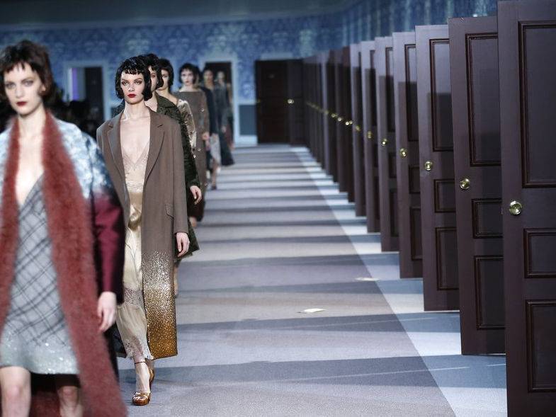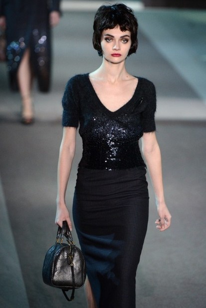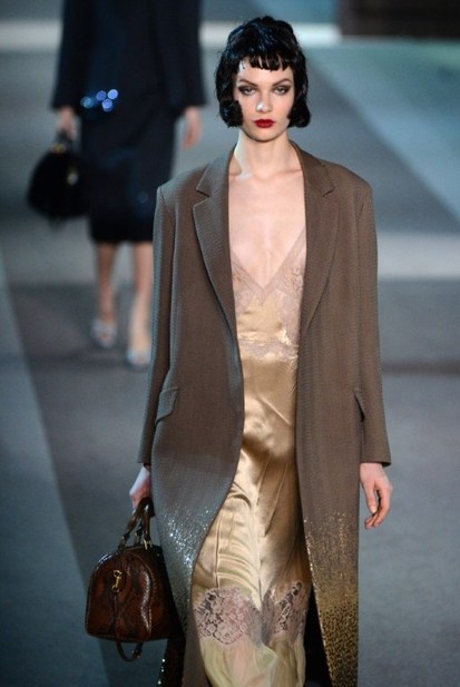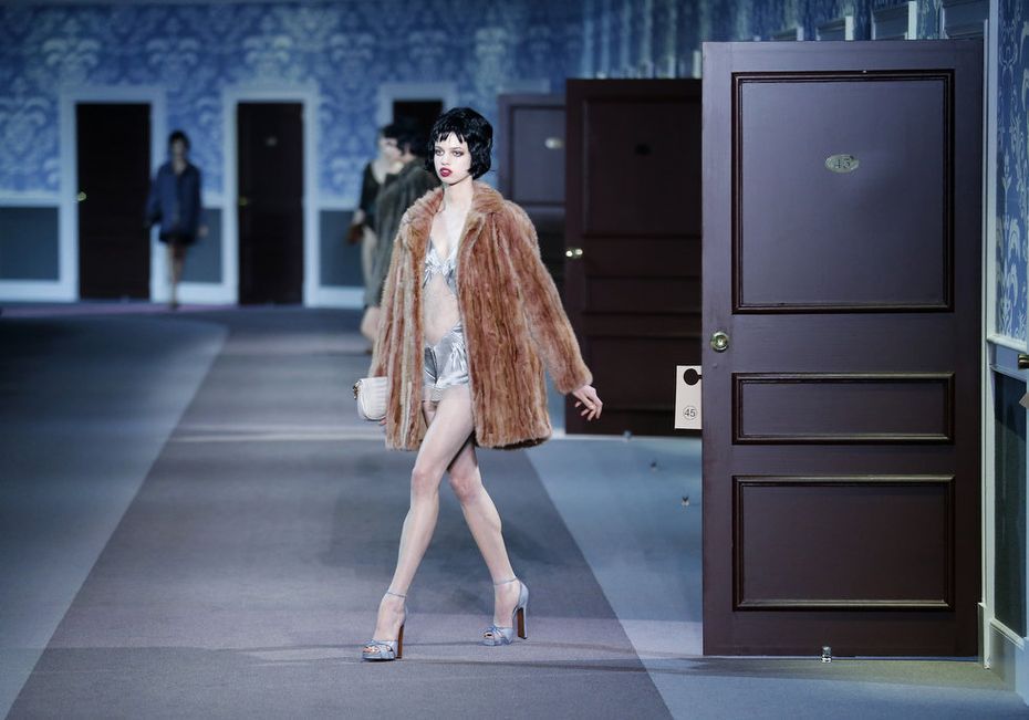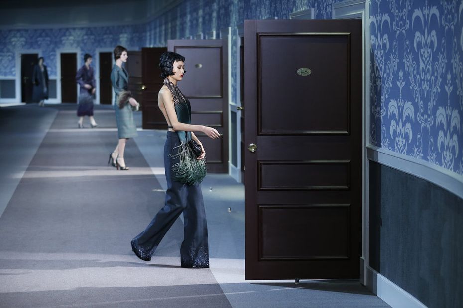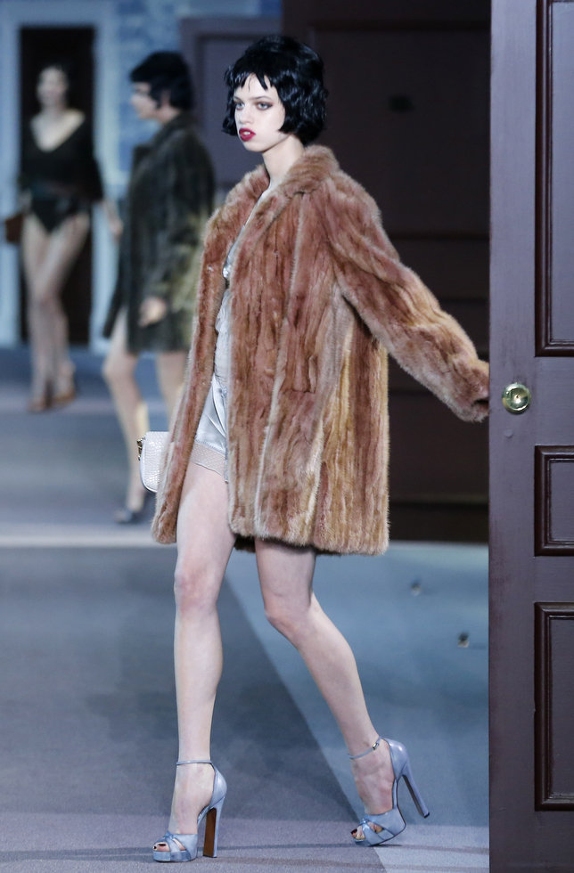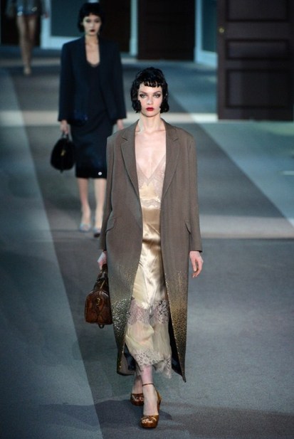 The classic Hollywood scene of a mysterious and glamorous woman leaving an anonymous hotel room inspired Louis Vuitton’s ready-to-wear show, moving the house in a more sensual, feminine direction. A carpeted hotel corridor with a series of numbered doors was recreated inside the Louvre for the fall 2013 show, to the sound of nostalgic piano.