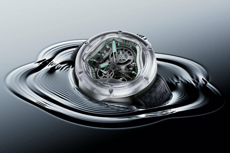 The Arsham Droplet seamlessly unites Hublot's technical mastery and Arsham's distinctive artistic vision, delivering a timepiece that pushes the boundaries of traditional watchmaking. Inspired by the organic, fluid forms found in nature, the Arsham Droplet is crafted from a harmonious blend of titanium, rubber and sapphire crystal. : Read Story
