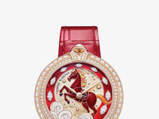 To engrave the dragon, Olivier Vaucher and his teams developed new hand-polishing and finishing techniques to enhance the natural transparency of the sapphire. The head and feet in carved red gold also serve to accentuate the crystalline texture of the sapphire and the volume of the subject. The minute details of the scales were the result of a long and delicate process of painting with gold, while applying these to the dragon’s tongue and eyes—giving it a determined look—added a final artistic dimension to the piece.
