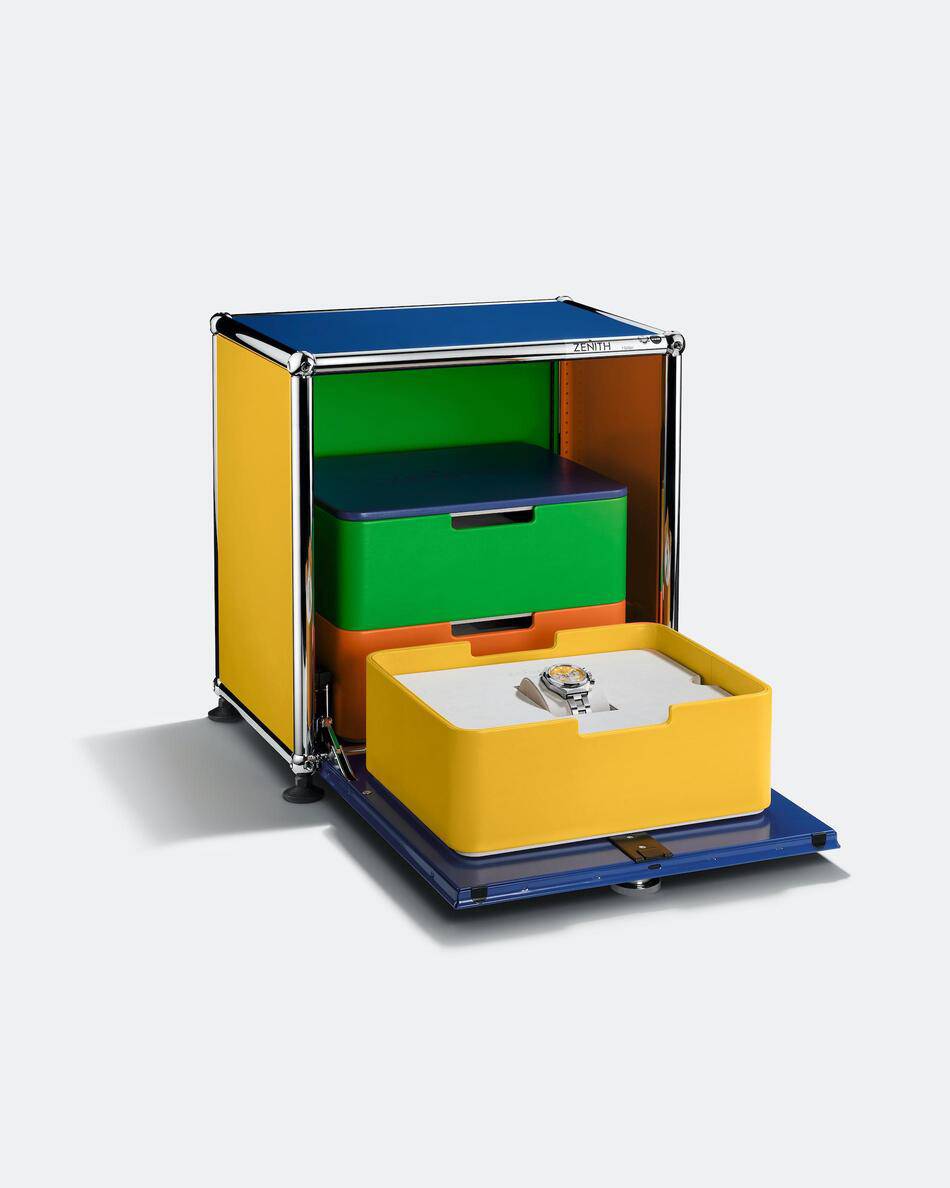 Born from the radical spirit of the 1960s, the partnership revisits a decade that redefined form and function. It was the era of the USM Haller modular system, patented in 1965, and the debut of ZENITH’s El Primero in 1969, the world’s first automatic high-frequency chronograph.