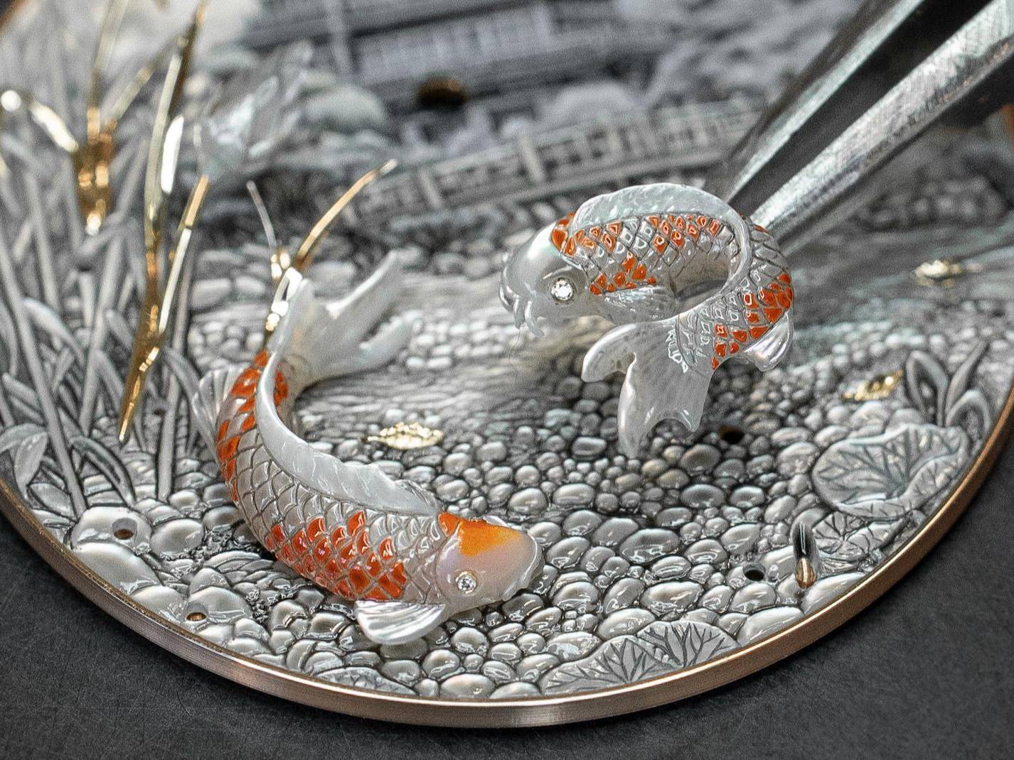 While mother-of-pearl is the primary medium, yellow gold is used for the cherry tree branches and the frame of the lantern. The realism extends to the very eyes of the carp, which sparkle with 0.5 mm diamonds. At the heart of the dial, a mother-of-pearl cabochon reflects the entire river scene, a technique reminiscent of the light in a Vermeer painting.