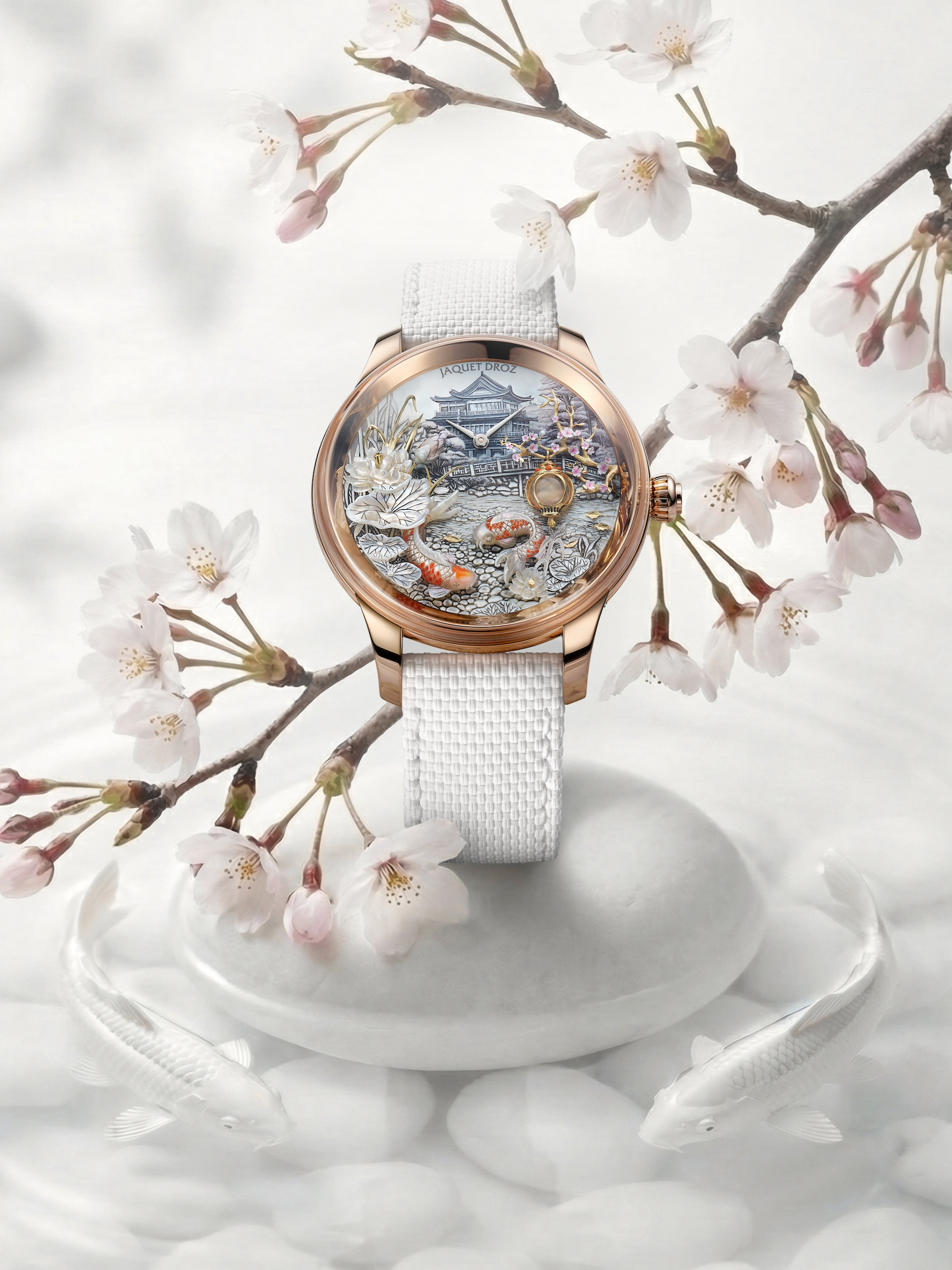A tranquil landscape of water lilies and koi carp has found its way onto the wrist. The creation by Jaquet Droz is a unique piece, a synthesis of excellence designed for a singular aesthetic.
