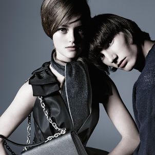 'Captured in Meisel’s New York studios, each photograph features a male/female couple, alternately aloof, or intimately entwined. The neutral gray backdrop focuses our eyes on theirs. The attitudes on display are elegance, poise and dare. The poses also elicit an infinite freedom to interpret the relationships between the characters and towards each of us looking. Gender’s complexities and contradictions have always been an essential, evolving question for Prada. What do men take from women? What do women keep for themselves? The most profound influences from one to the other are often the least apparent, the least visible. These exchanges still charge the cultural sphere. Like the Prada Men’s FW15 show-space, somber blues and blacks pervade the collections, especially a heavy use of black nylon, extending to eveningwear also. Nylon is one of Prada’s iconic fabrics, particularly so when coupled with the allusion to uniforms, another Prada DNA. These hard monochromes are periodically softened by a wool, camel coat or textured, camouflaged checks.' – from PRADA