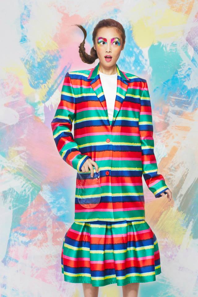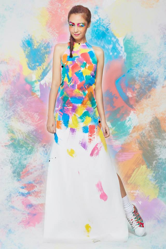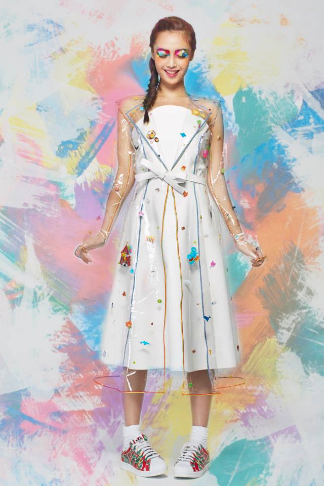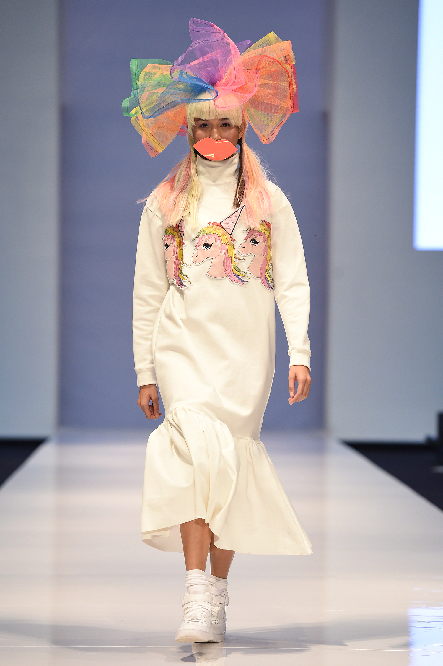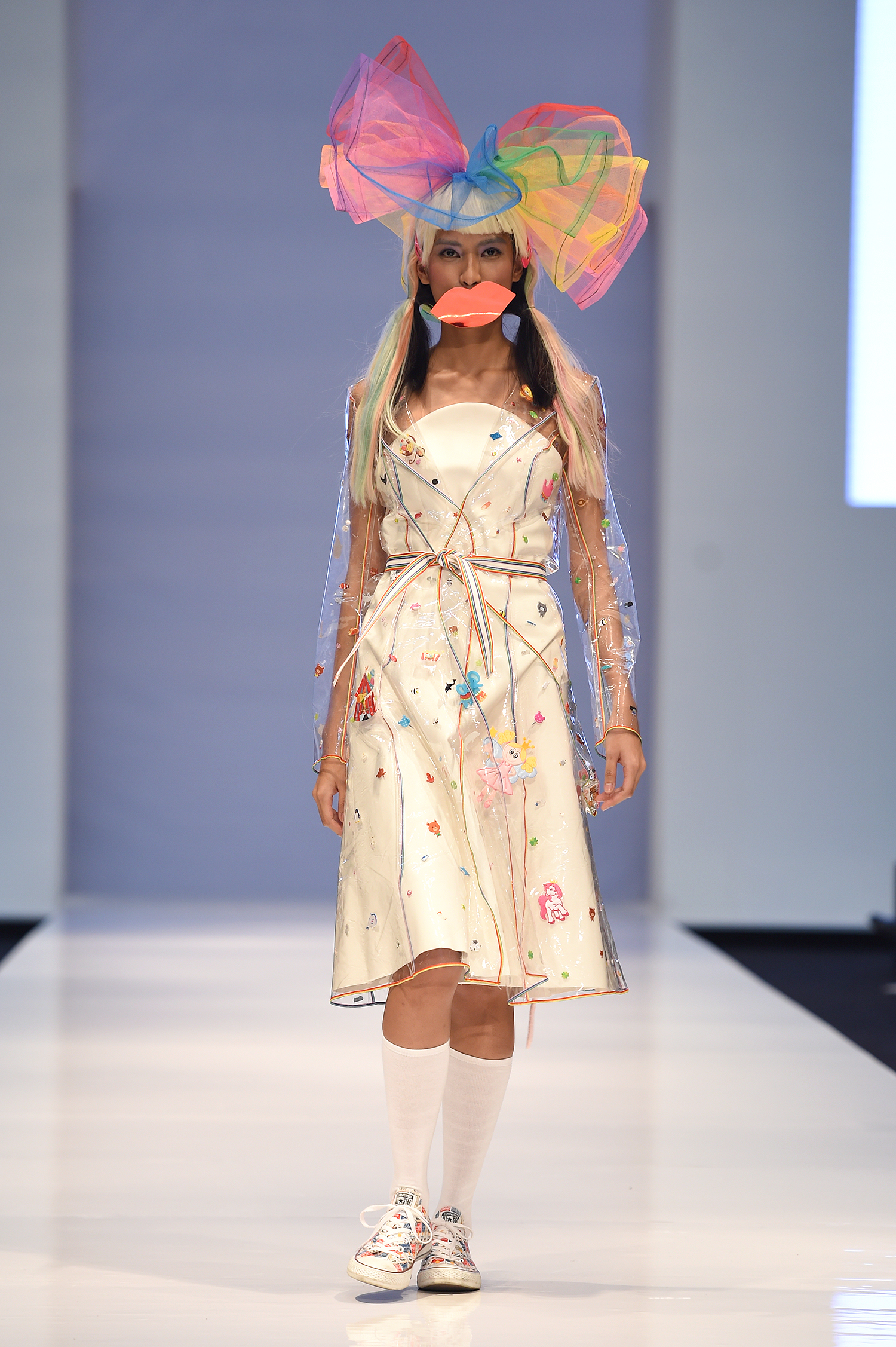 Malaysian designer Kittie Yiyi’s imagination never ceases to stimulate. She may be inspired by colour, texture, image of anything that she finds stimulating. A story then slowly develops, and that results in a final collection. For her spring-summer 2016 collection, presented during Kuala Lumpur Fashion Week Ready To Wear 2015, she infused whimsical touches and compositions which reflected the upbeat mood of youthful generation. The celebration of youth culture has been integral to the establishment of the Kittie’s aesthetic. She sent a quirky trench coat in clear plastic embellished with cartoon figures down the runway. Hand-painted dress with vibrant colour palette, a pop-up unicorn on an oversized jumper, fringe dress and hoodie punctuated with playful patterns that challenged contemporary fashion.