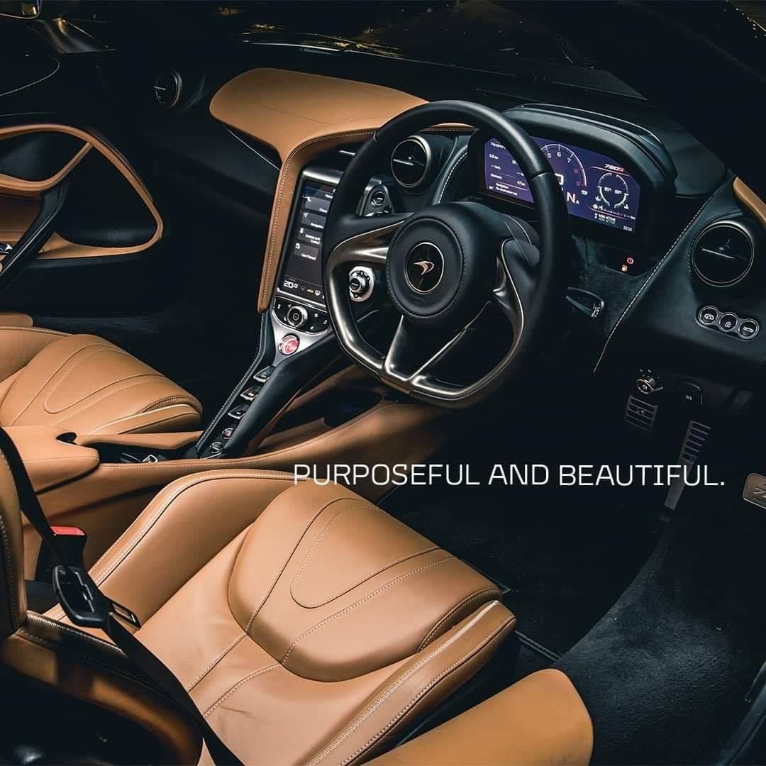 The contours of the 720S are distinctly McLaren, yet the details are boldly different. Our designers took inspiration from the Great White Shark, a beautifully sleek yet brutally efficient hunting machine. The resulting design for the 720S is exquisite form following ingenious function. The smooth flow of the exterior lines manipulates onrushing air to reduce drag and cool the engine. Slim pillars on the teardrop-shaped cabin allow for the extraordinary glass canopy that floods the interior with daylight and offers unrivalled visibility.