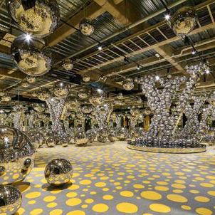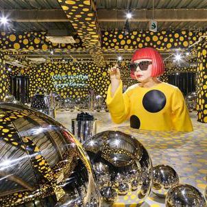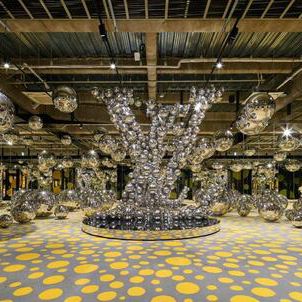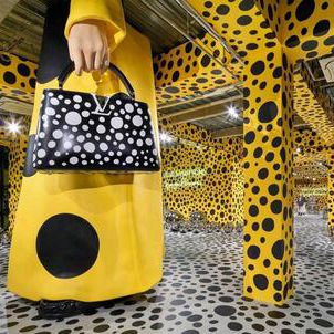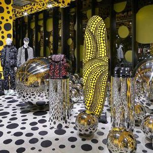 Inside the space, the French fashion house has crafted a massive, lifelike sculpture of Kusama, who wears a yellow and black polka-dot shirt and dons her signature red hair. The walls boast an all-over, inverted pattern to the artist’s top, offering a pleasant contrast to the glorious centerpiece. In one corner, a collection of mirrored balls convene to form Louis Vuitton’s signature LV iconography; and in another, mannequins spotlight polka-dotted designs in the foreground of a neon sign that reads, “Louis Vuitton x Yayoi Kusama.”