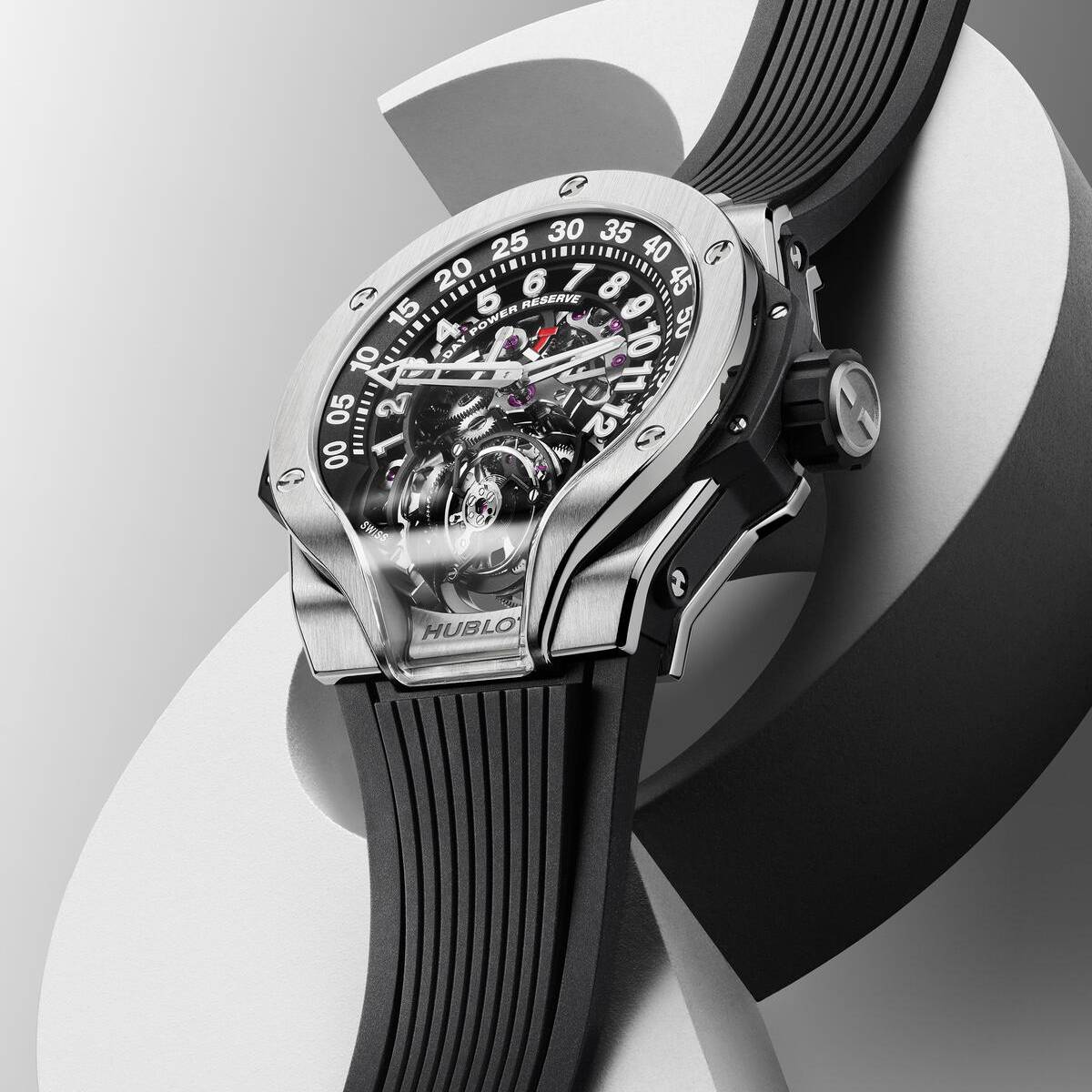 The 44 mm timepiece is encased entirely in brushed titanium and for the first time brings together two complications— the tourbillon and the retrograde display— in one, unique watch. the tourbillon features two axes—a considerable feat, as Hublot is one of only a few watchmakers capable of manufacturing a double-axis tourbillon entirely in-house, having first done so with the MP-09 in 2017. The tourbillon completes a full rotation every minute on one axis, and every 30 seconds on the other. Having two speeds within the same mechanism creates a view that is both hypnotic and technical.