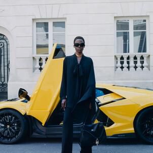 The Balenciaga | Automobili Lamborghini campaign by Stef Mitchell features Liz, Agel, Abdou, and Mihai styled in pieces from the collaboration—set against the backdrop of the Lamborghini Revuelto.