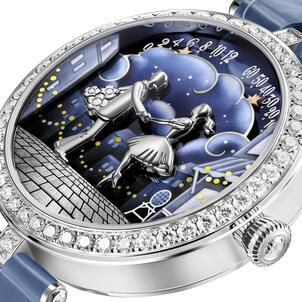 Powered by an automaton movement developed over four years of research, the watch once again brings the figures together in a tender kiss at noon and midnight — a gesture that can also be summoned at will with a press of the case button. The dial is a masterpiece of craftsmanship, crafted in grisaille enamel, a demanding technique requiring up to a dozen kiln firings per dial to achieve its subtle depth and delicate luminosity.