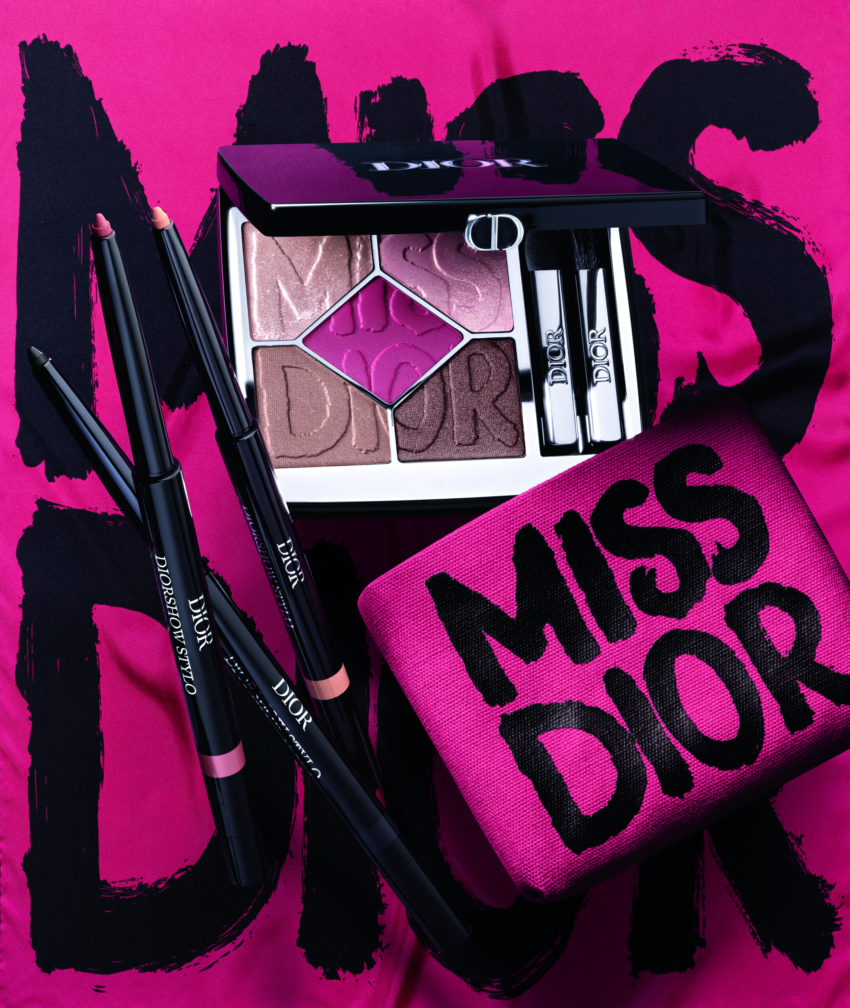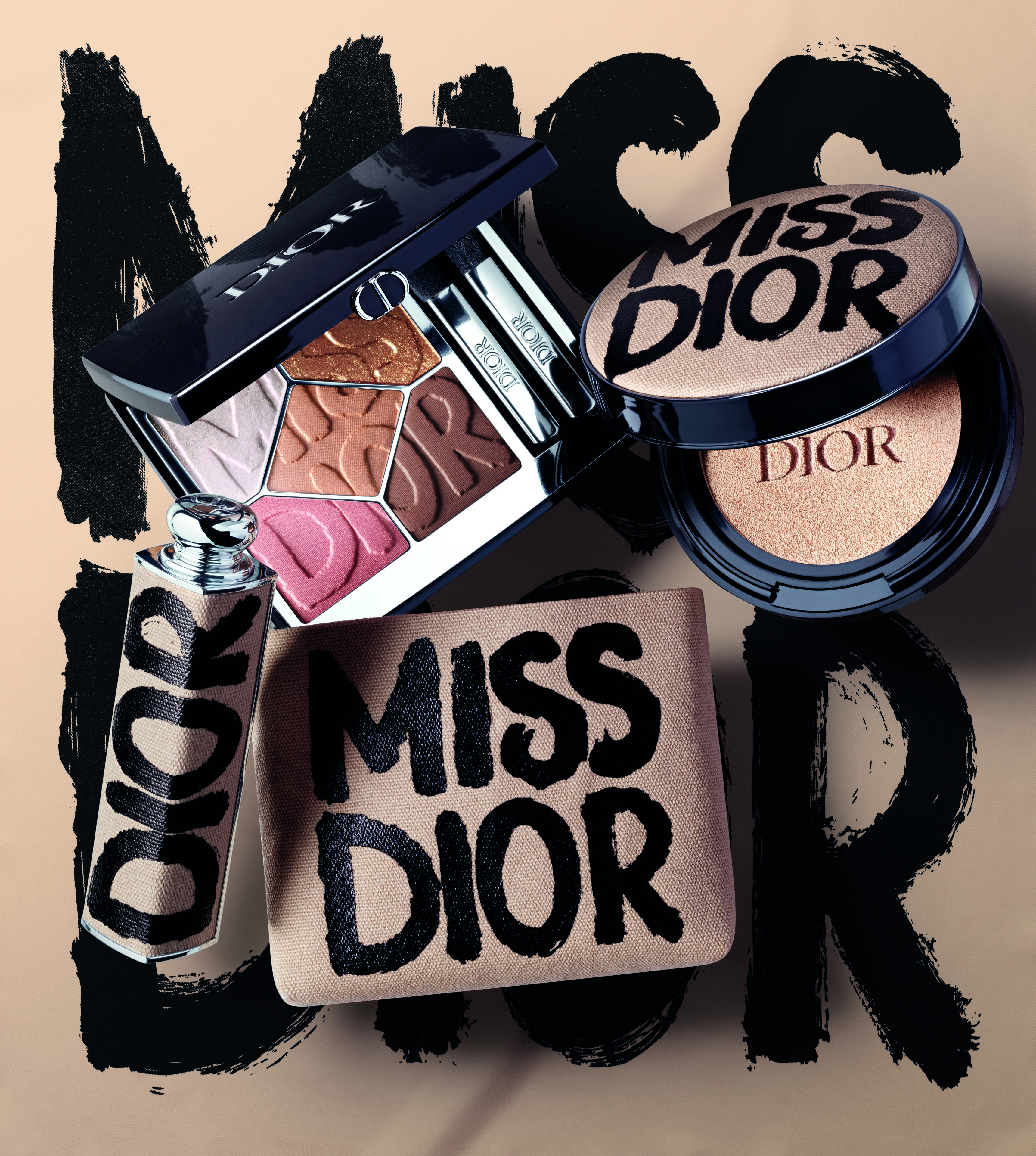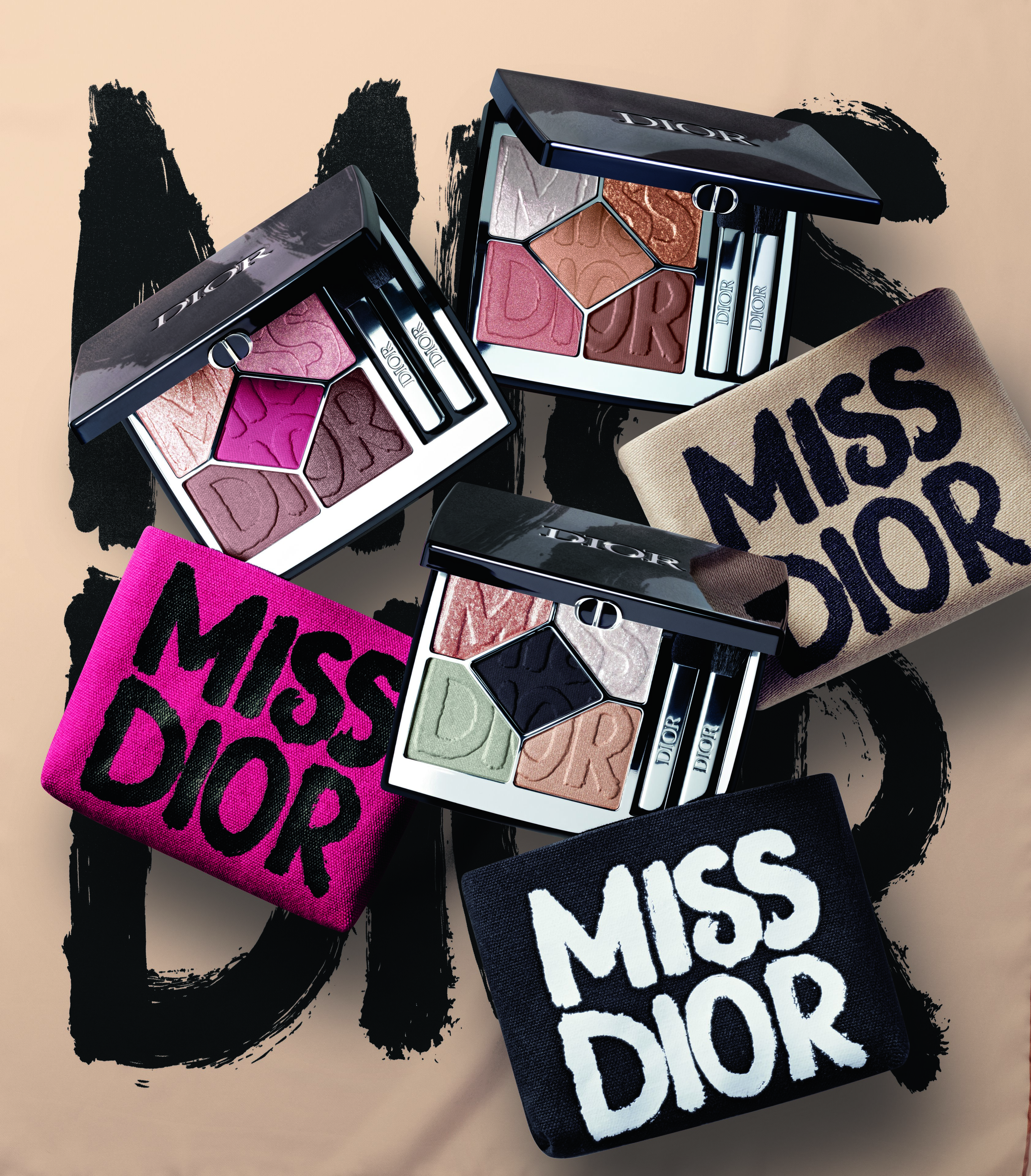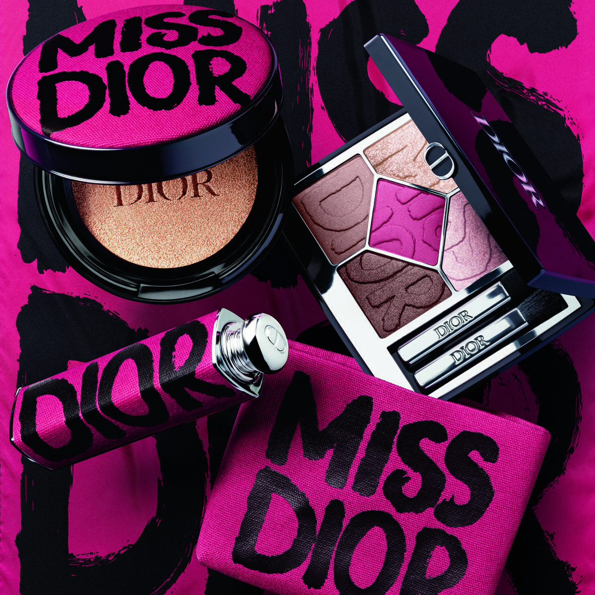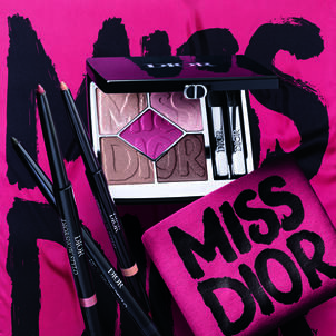 Borrowing the graffiti-logo energy of the House archives, the collection arrives in three arresting mini-wardrobes—Shocking Pink, Bold Black, and Wild Beige—each one rewriting beauty codes for women who live audaciously. Eyes are transformed by Diorshow 5 Couleurs palettes etched with couture motifs, from the rebellious fuchsia heart of Shocking Pink to the radical noir of Bold Black and the sun-kissed warmth of Wild Beige.