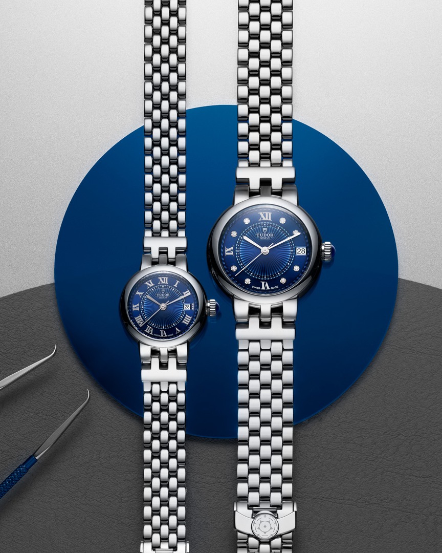 The centerpiece is the captivating “TUDOR Blue” dial. This deep, mesmerizing shade is enhanced by an exquisite embossed motif that catches the light with subtle, hypnotic texture. Against this celestial canvas, polished Roman numerals provide a striking framework, but it's the diamond-set hour markers that truly elevate the design. Each one shimmers with a quiet, confident brilliance, marking the passage of time with pure glamour.