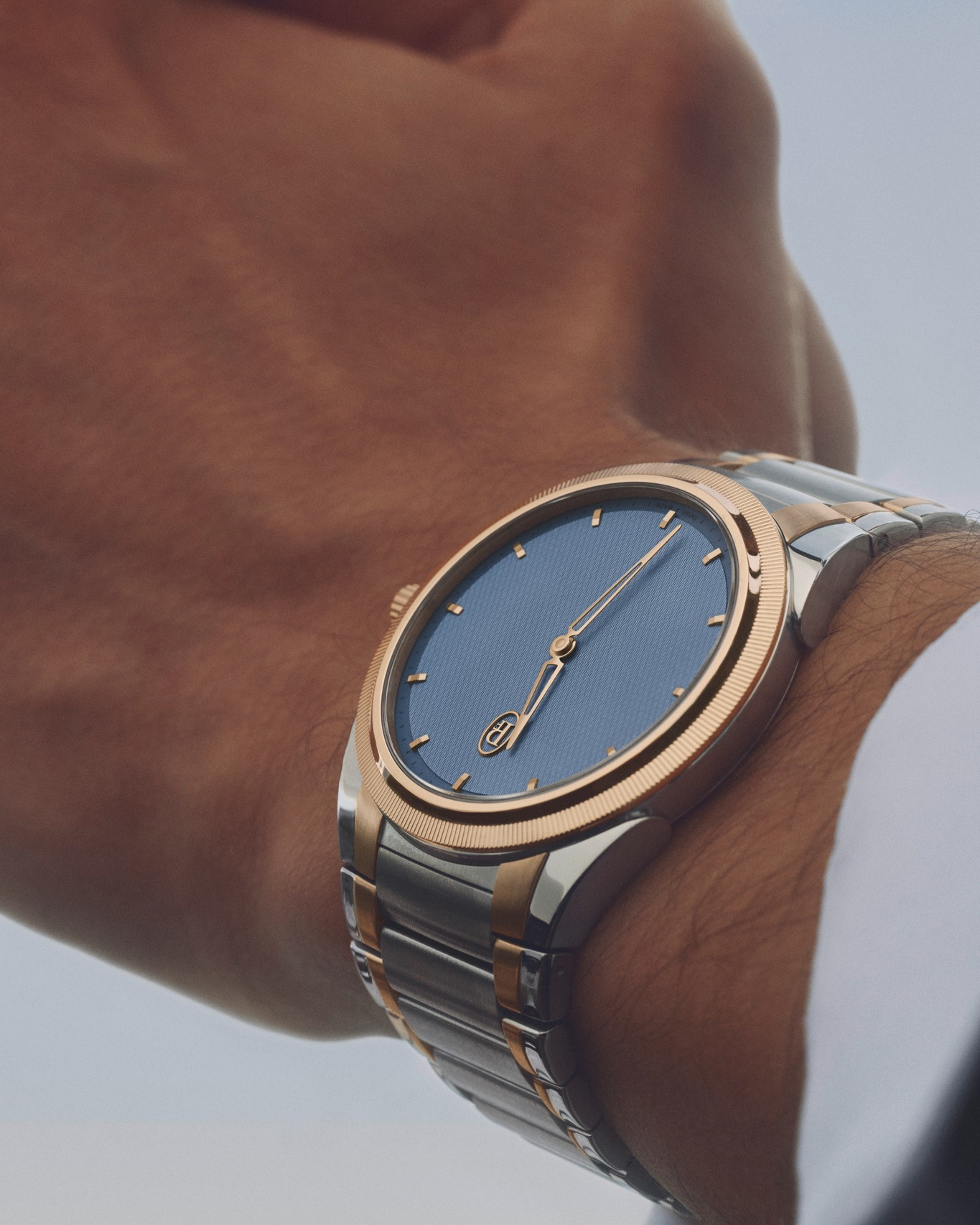 Framing this masterpiece is a finely knurled rose gold bezel that catches the light and flows seamlessly into the integrated bracelet, where polished and satin finishes alternate to create a subtle, textural richness.