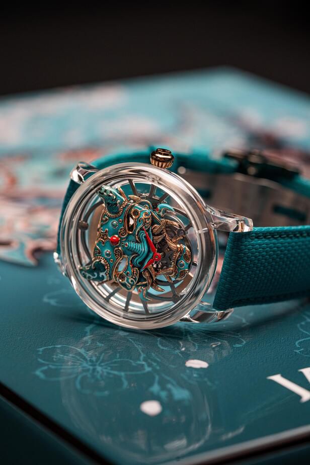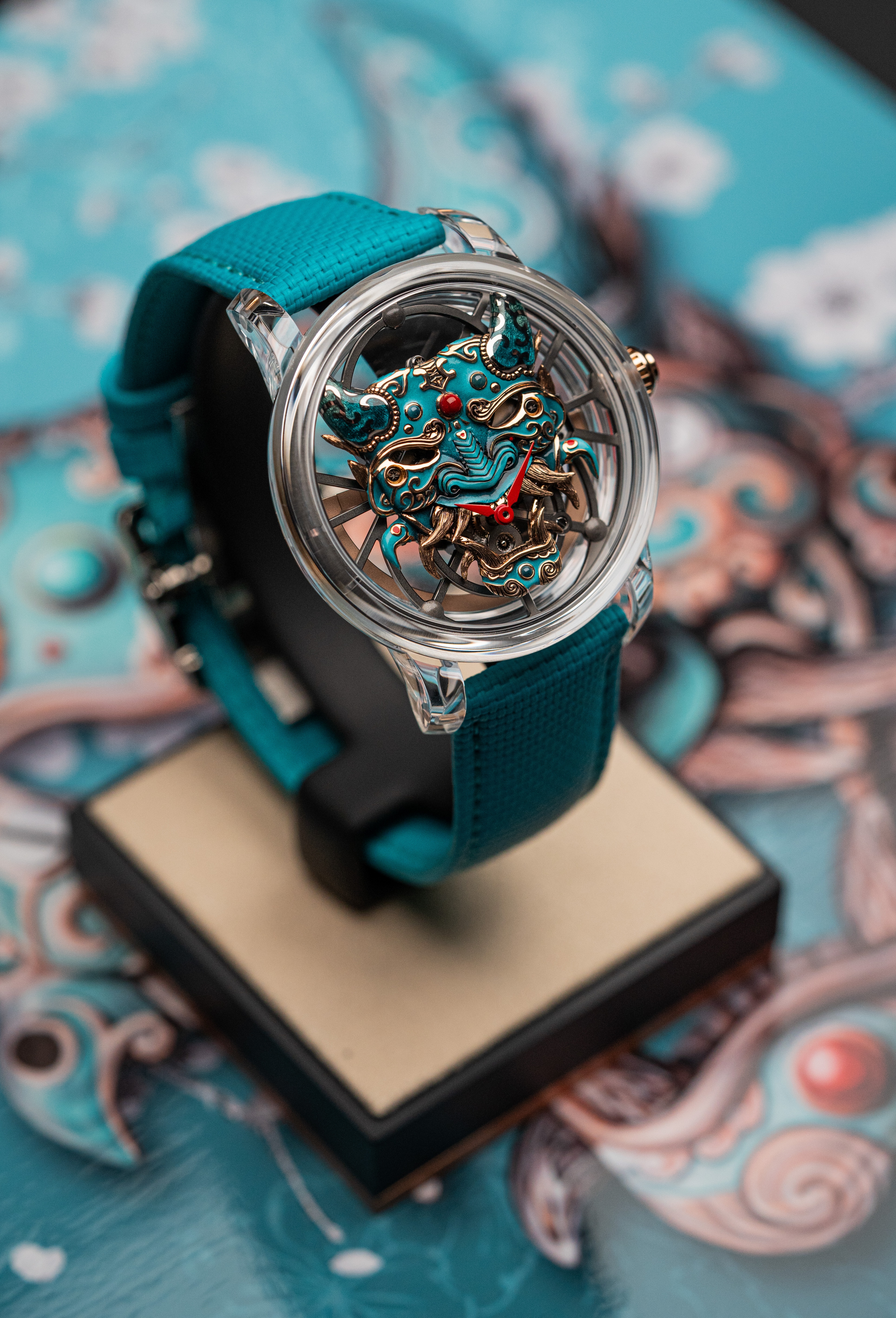 Jaquet Droz called upon a team of master craftspeople including engravers and painters to achieve this level of detail. The main surface is hand-painted while the horns are crafted from translucent enamel. In a premiere for the brand the face features a setting of Murano glass beads that accentuate the dominant jade color and the menacing red accents found on the hands. Intaglio engraving on a red gold base underscores the eyes and mouth to ensure that none of the surfaces remain flat.