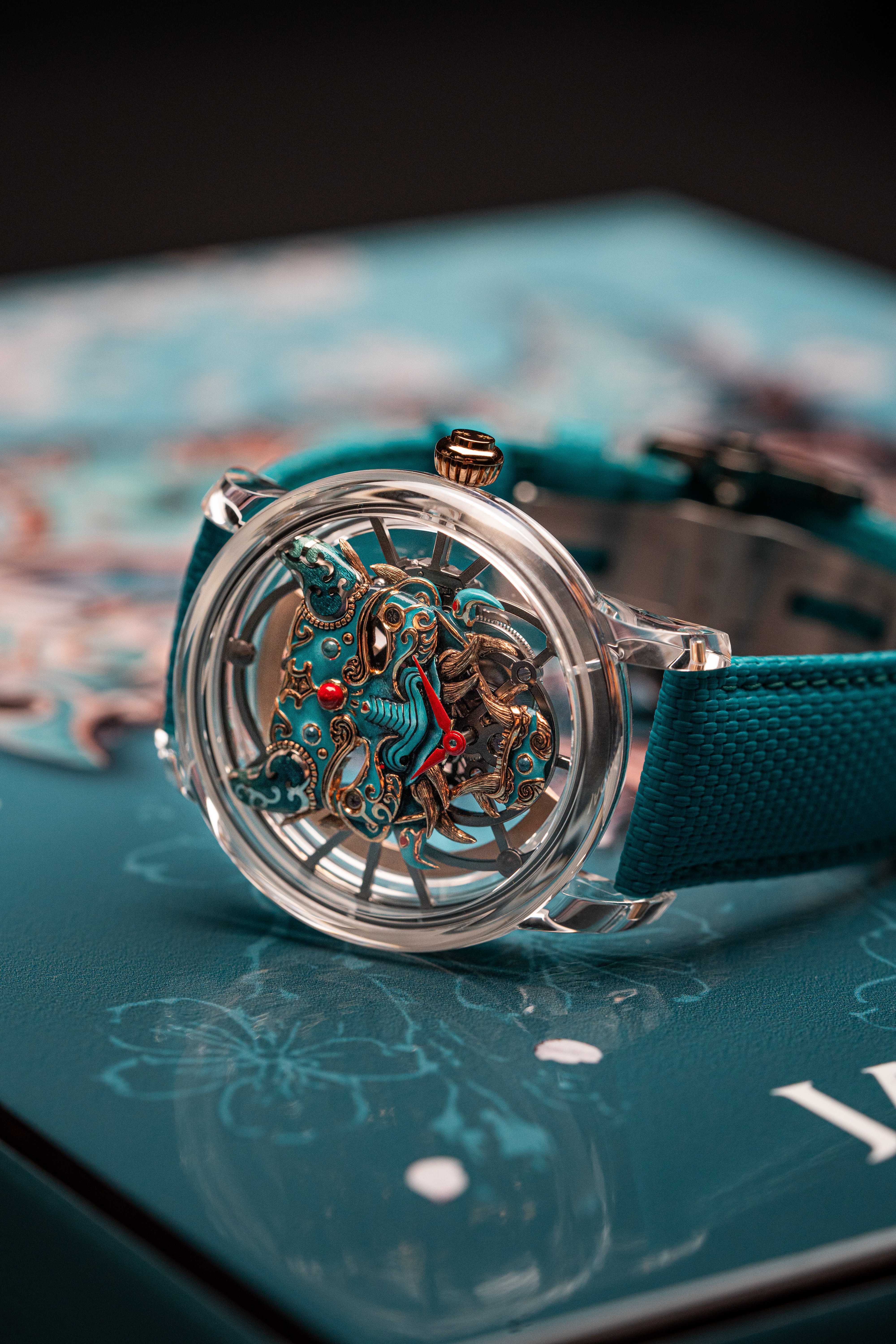 The visual impact is immediate as micro-sculpture takes center stage to ensure the mask emerges in three distinct dimensions. A 100 percent sapphire case creates a spectacular illusion that the mask is being worn directly on the wrist. This transparent housing is a tour de force that is manufactured entirely in La Chaux-de-Fonds without the use of screws or inserts. The result is a perfectly clear and unobstructed view that allows the most intricate details of the craftsmanship to be admired from every angle.