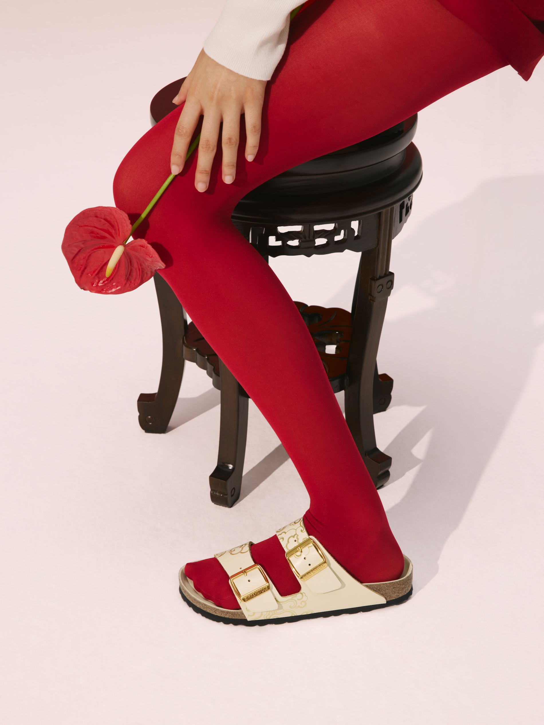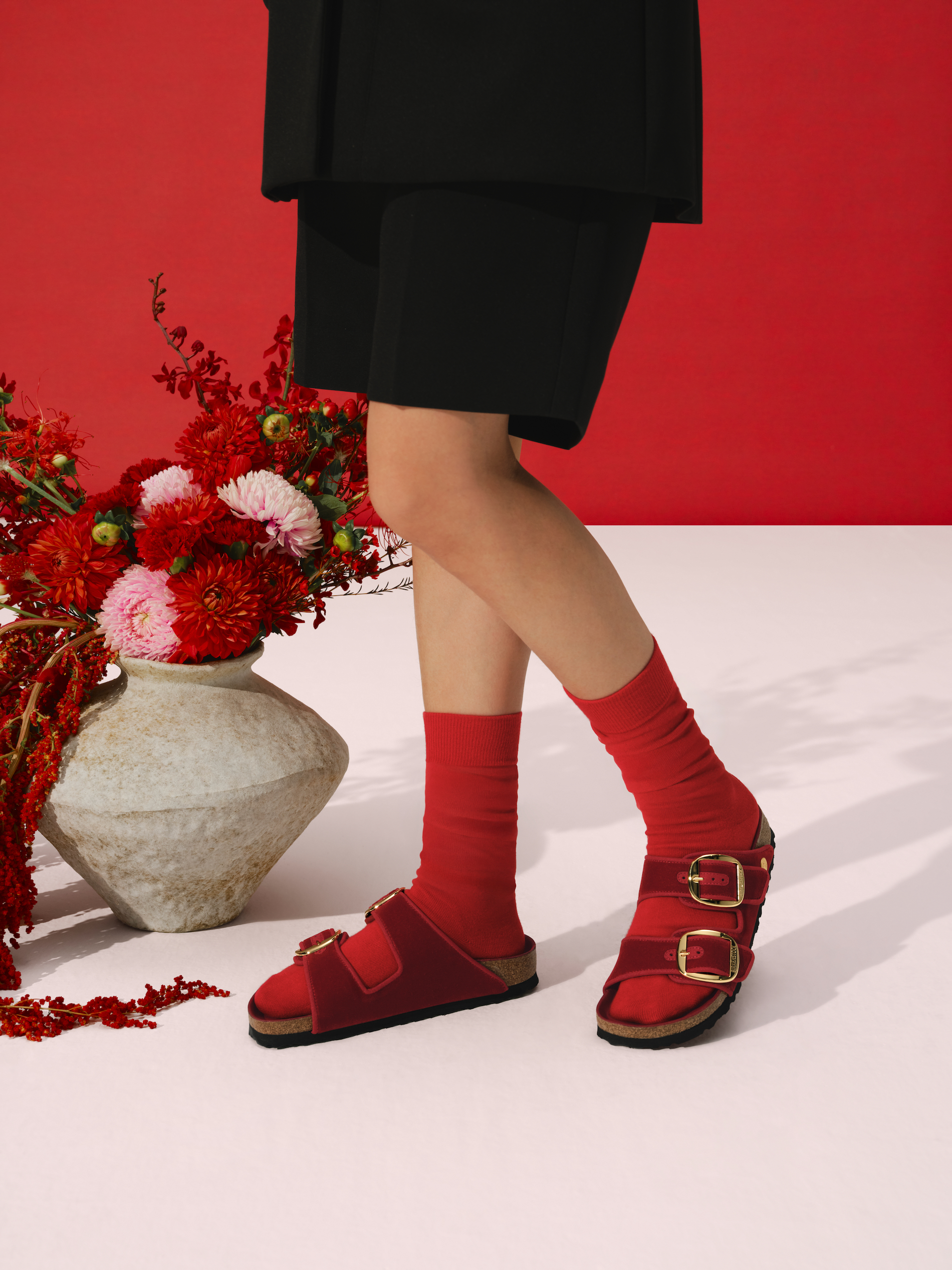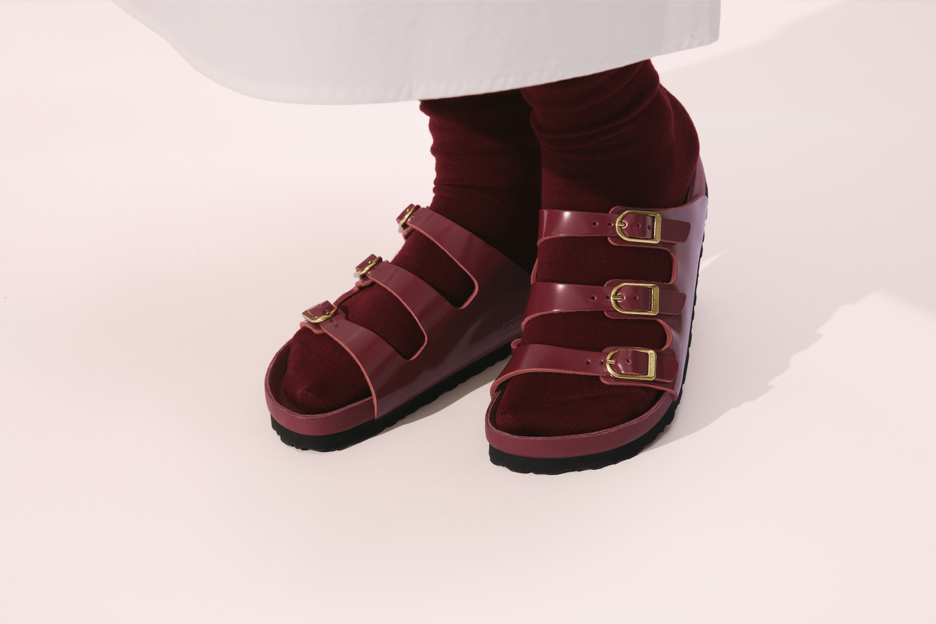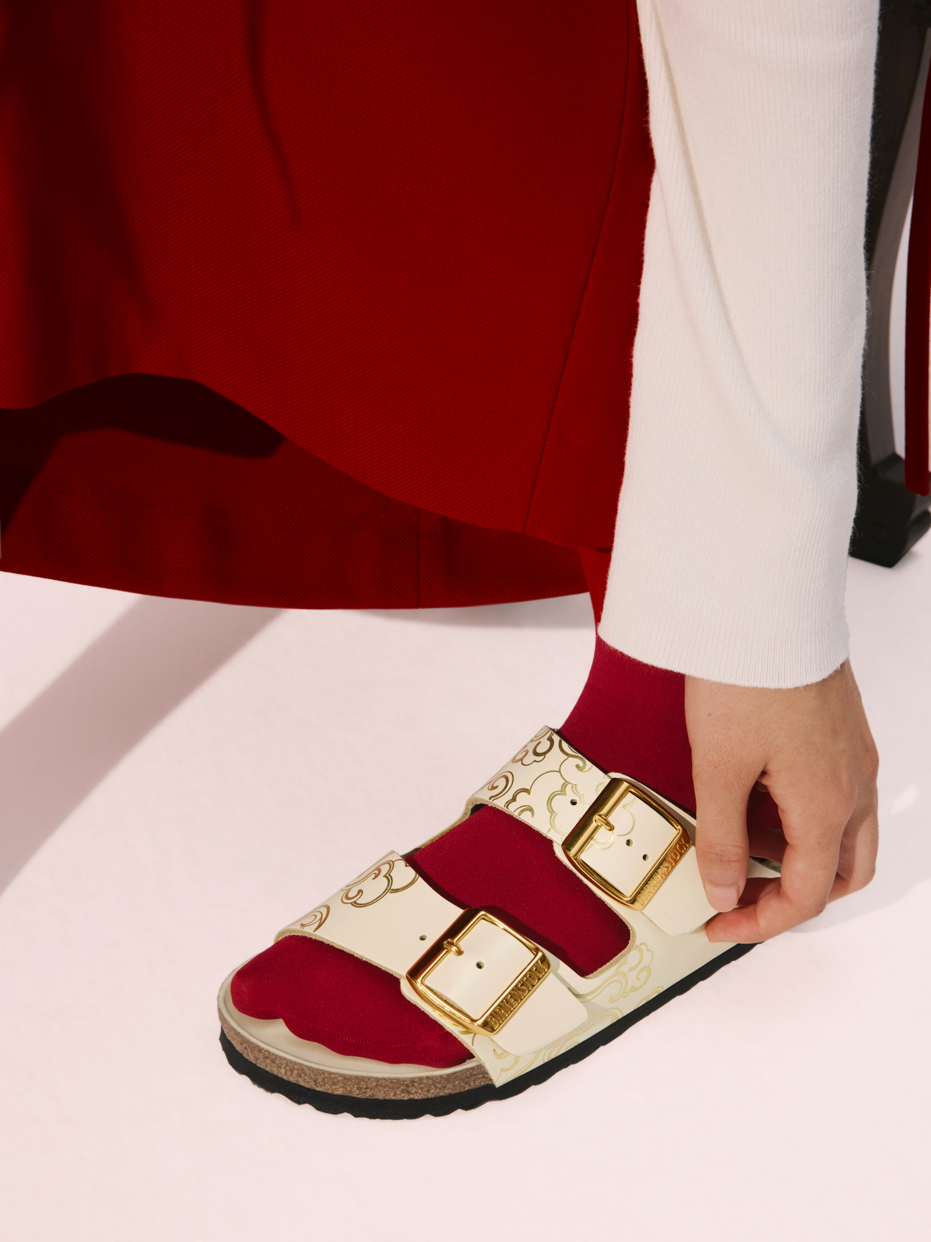The Florida fine strap sandal receives a sophisticated execution in a deep Zinfandel red, a color chosen to represent the prosperity and good fortune central to the festival. Adorned with three golden D-buckles and high-shine leather, this interpretation brings a sense of uncompromising luxury to the original cork-latex footbed. The deep red hue serves as a direct nod to cultural traditions that believe wearing the shade invites success in the coming year.
