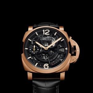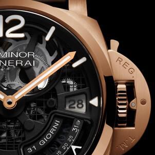 The PAM01631 embodies the iconic design of the Luminor within a 44mm case crafted from Panerai Goldtech™. This special alloy, composed of gold and copper with a touch of platinum and silver, offers a distinctive red hue and elevated durability. The skeletonized structure provides a multi-dimensional view of the mechanics, which is amplified by a see-through sapphire crystal caseback.