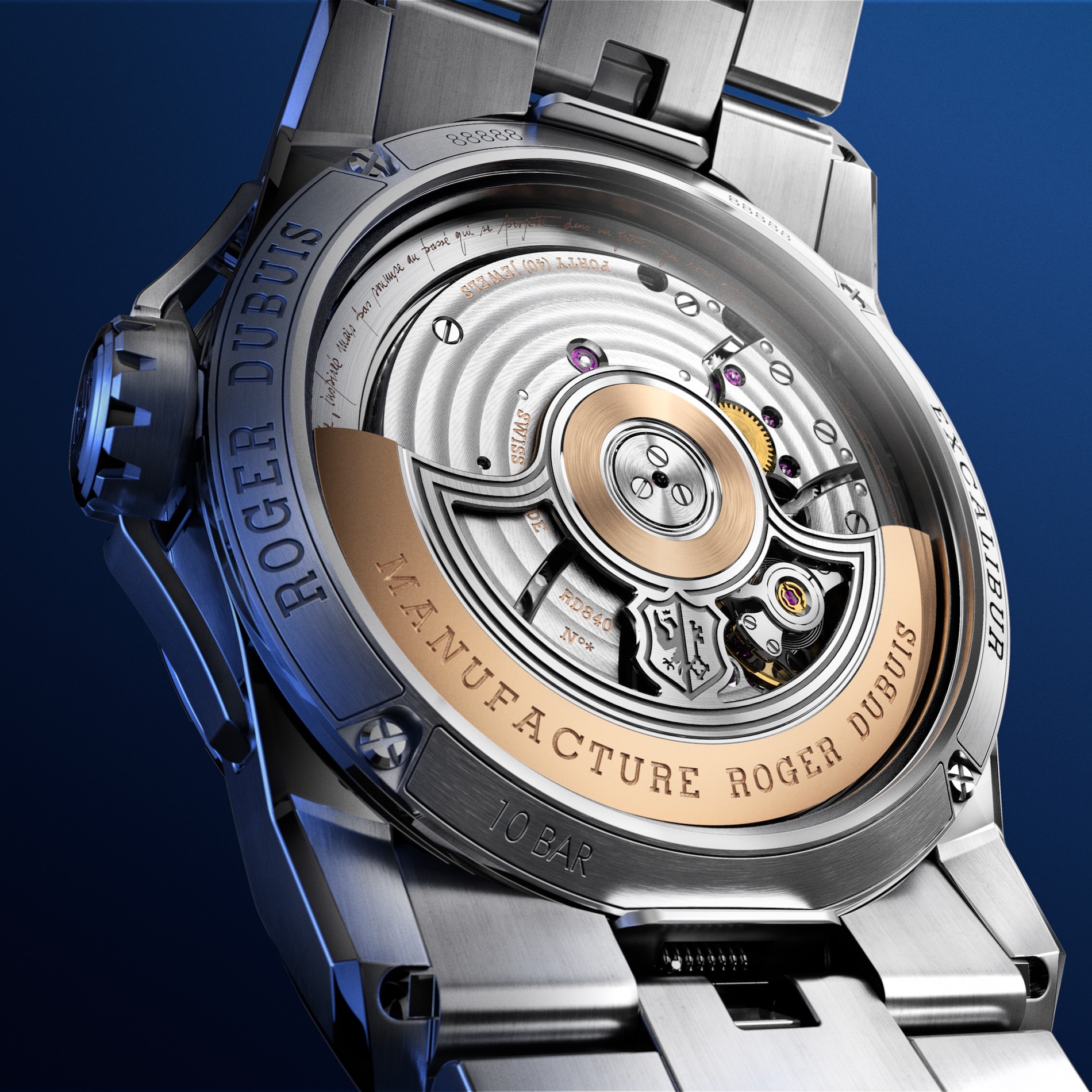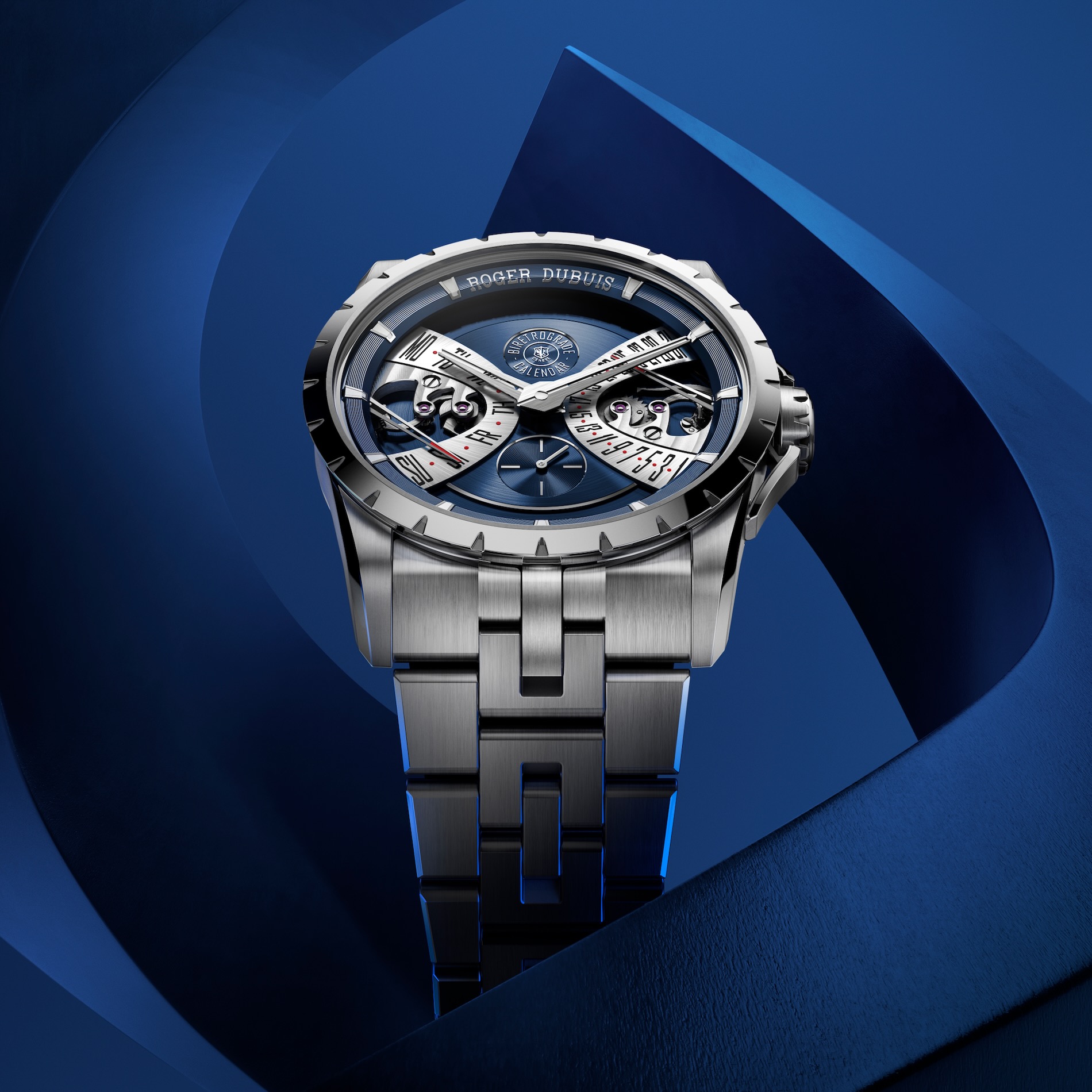 Crafted entirely in 316L stainless steel, the watch is elevated through a mix of polishing, shot blasting, and satin brushing to create a variety of light reflecting surfaces. The seven levels of the signature multi-layered dial showcase the Roger Dubuis colour known as "Cosmic Blue". This specific shade represents the inspiring sky on Earth when daytime blue darkens into night, bringing the curiosities of space into view.